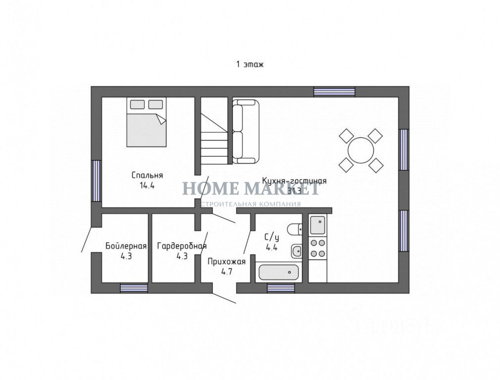 1 этаж: просторная кухня-гостиная с выходом на террасу, гостевая спальня, санузел с душевой, бойлерная, гардеробная,