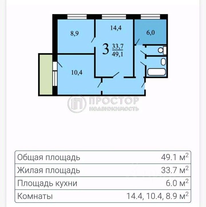 В квартире раздельный санузел, комнаты имеют площадь 14,4 кв. м, 8,9 кв. м и 10,4 кв. м соответственно. Кухня площадью 6 кв. м.