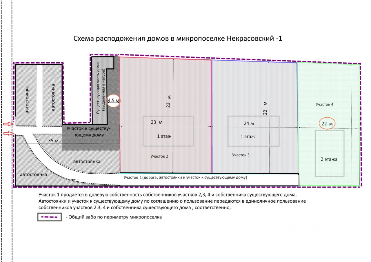 Уникальное предложение! Продается новый строящийся коттедж в поселке Некрасовский. Срок сдачи - 5 месяцев с момента заключения договора подряда. Подрядчик аккредитован в Сбербанке и Дом.рф Подходит под Семейную ипотеку Площадь коттеджа 130 кв.м. Коттедж расположен на территории микропоселка. Микропоселок состоит из четырех отдельно стоящих коттеджей, каждый из которых располагается на своем собственном участке (на схеме микропоселка участки2,3, и 4) и общей территории микропоселка -автостоянка и дорога (на схеме микропоселка участок 1) . Коттедж имеет уникальное месторасположение. С одной стороны он находится всего в десяти минутах ходьбы (850 м.) от железнодорожной Станции Некрасовская, что позволяет в течение 30 минут добраться до центра г.