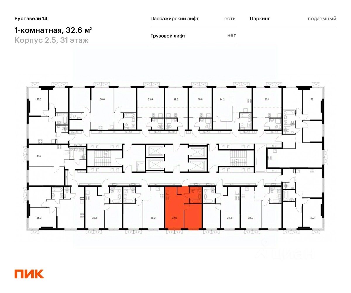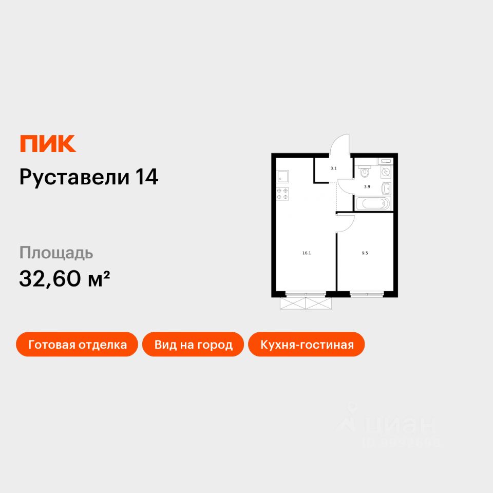 Продаётся 1-комн. квартира площадью 32,6 кв.м на 31 этаже 33 этажного дома (Корпус 2.5, Секция 1) проекта ПИК Руставели 14. Светлый просторный подъезд на уровне земли, функциональная планировка, большие окна, c отделкой.