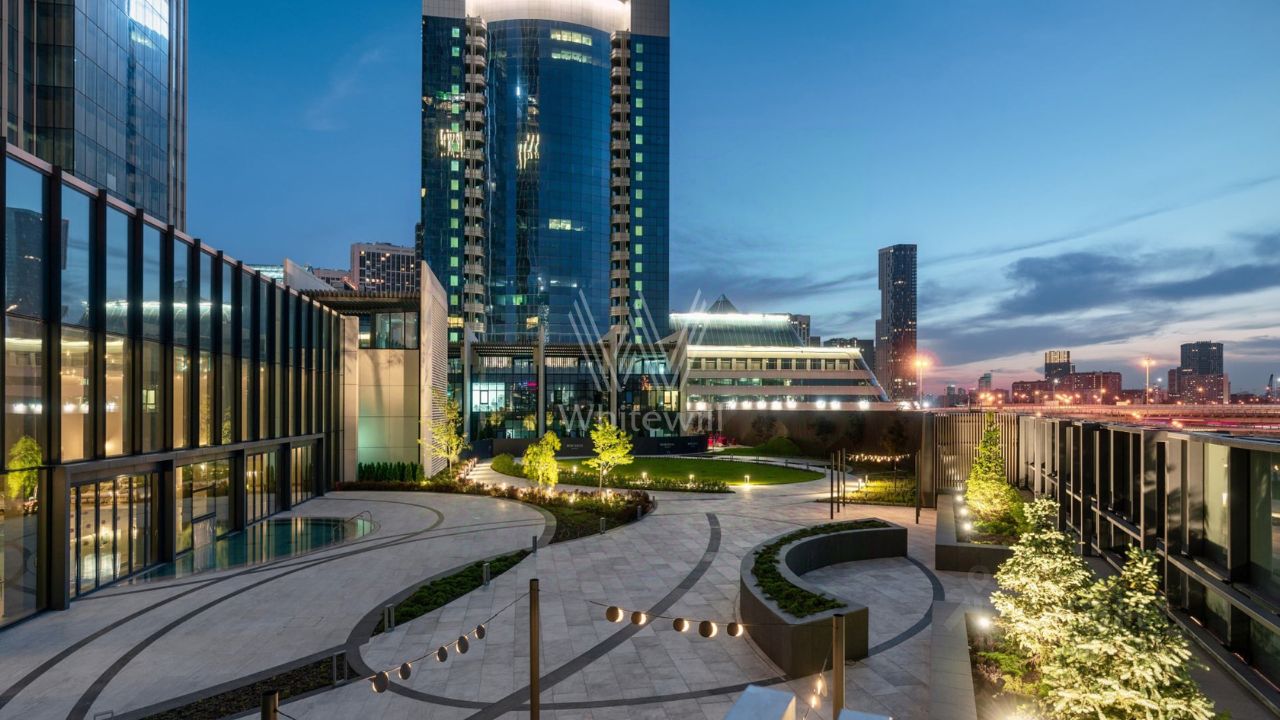 Главное о доме. Neva Towers — две башни в Москва-Сити с лобби на высоте атриума и панорамами делового центра. На стилобате обустроили приватный парк для жителей: газоны, шезлонги, дорожки и воркаут-зона — удобно выйти на солнце прямо из корпуса. В галерее у основания работают кафе и рестораны, рядом — повседневные сервисы. Внутри — клубные пространства и Crocus Fitness с бассейном под открытым небом, джакузи и спа-зоной. Вечером архитектурная подсветка подчёркивает силуэт башен, и двор превращается в тихую террасу над городом. Для автомобилей предусмотрели многоуровневый паркинг с лифтовым доступом к лобби.