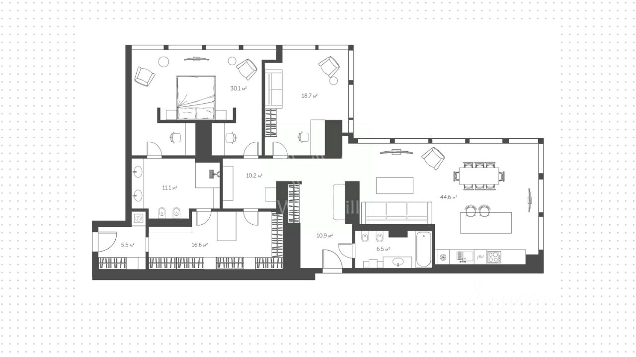 Видовые апартаменты с двумя спальнями общей площадью 160 м² в комплексе небоскрёбов премиум-класса Neva Towers. Угловой апартамент расположен на 37-м этаже в ''Башне 2''. Выполнена премиальная дизайнерская отделка, интерьер оформлен в современном стиле. Из панорамных окон открываются живописные виды на город на две стороны света. Планировка: угловая кухня-гостиная, мастер-спальня со своей ванной комнатой и гардеробной, спальня с угловым остеклением, ванная комната, холл. Апартамент полностью укомплектован мебелью и бытовой техникой. Одно машиноместо в подземном паркинге.