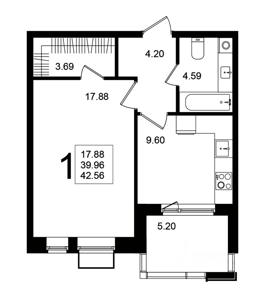Продаётся 1-комнатная квартира в строящемся доме (Корпус 6), срок сдачи: 2-кв. 2026, общей площадью 42.56 кв.м., на 4 этаже.