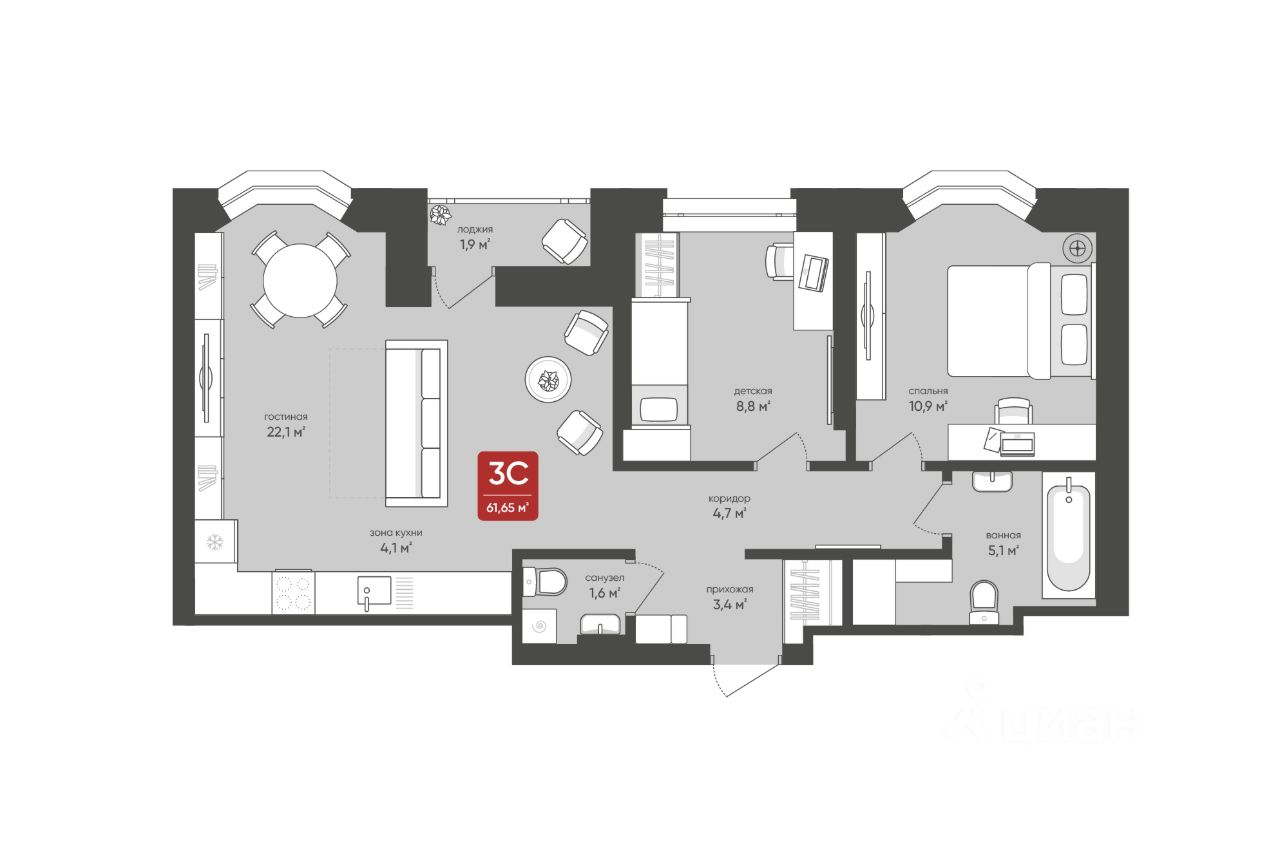 Продаётся 3-комнатная квартира в строящемся доме (Дом 1), срок сдачи: I-кв. 2026, общей площадью 61.65 кв.м., на 10 этаже. Новая жизнь в удобной локации Дзержинского района! Промышленная, 7 новый дом вблизи Березовой рощи!