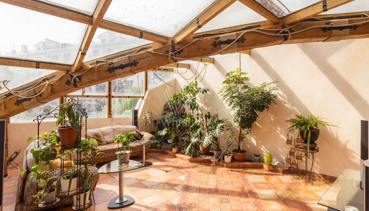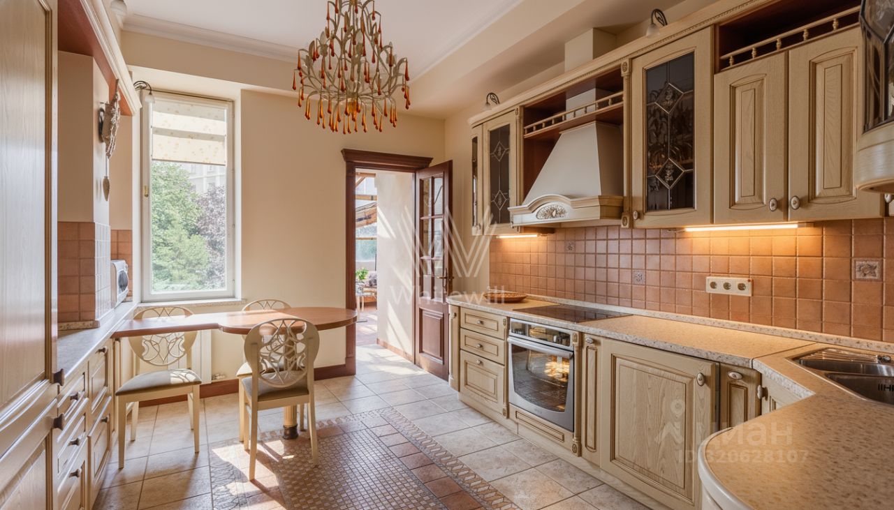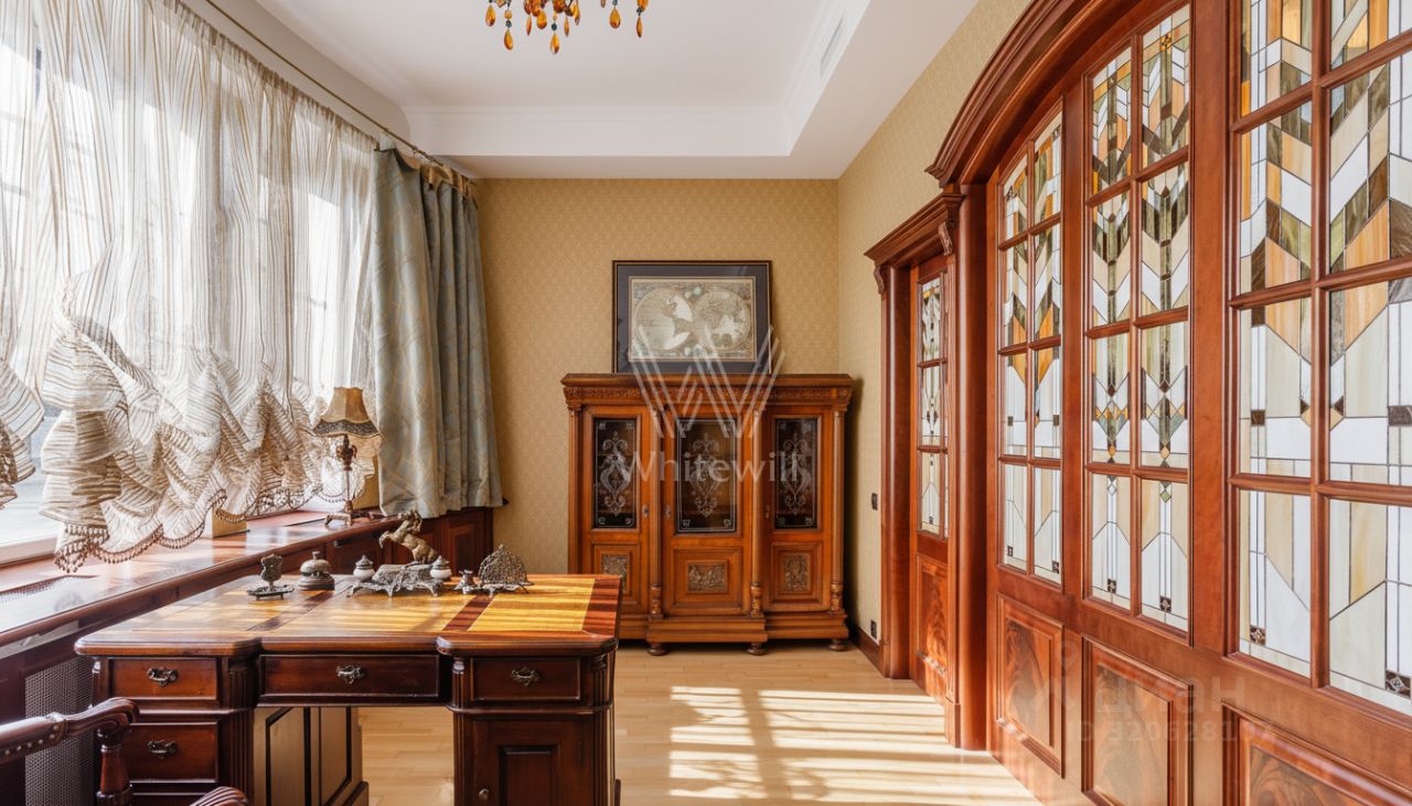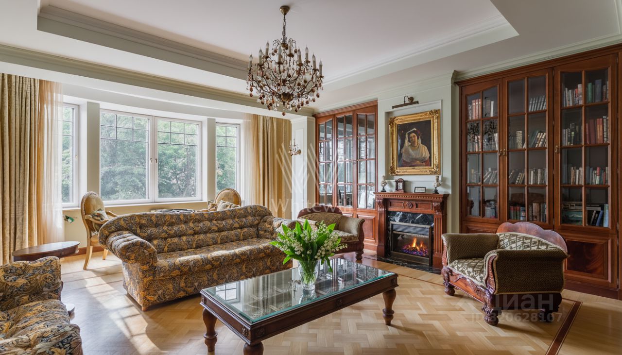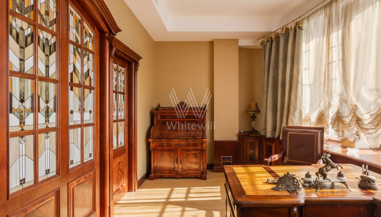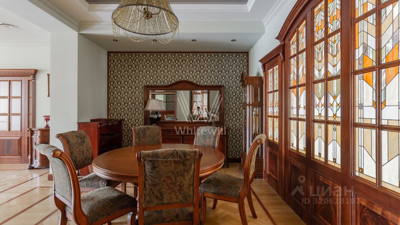 Квартира площадью 241 м² с зимним садом в комплексе ''Венский дом'' на втором этаже. Выполнен ремонт в классическом стиле, в отделке использовано натуральное дерево и камень. На полу выложен светлый паркет с плетёным узором. Стены в спокойных тонах украшены картинами и светильниками в виде подсвечников. Квартира полностью меблирована, почти вся мебель из тёмного дерева. В гостиной с витражными дверьми спланирована зона отдыха у камина, столовая зона с круглым столом на шесть персон. Оборудована кухня цвета слоновой кости с бытовой техникой. На застеклённой террасе обустроен зимний сад с мягкими диванами в леопардовой обивке.