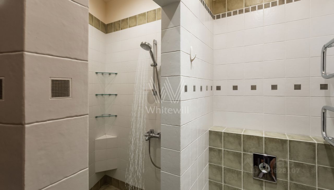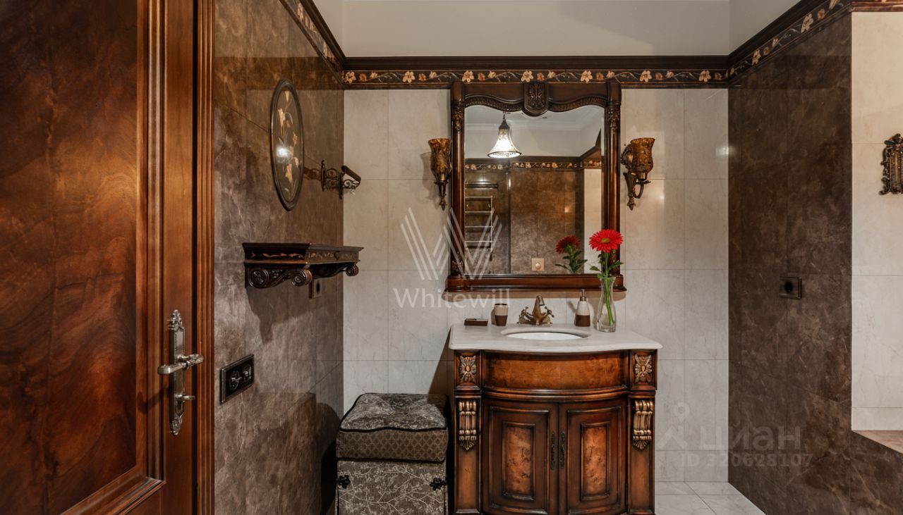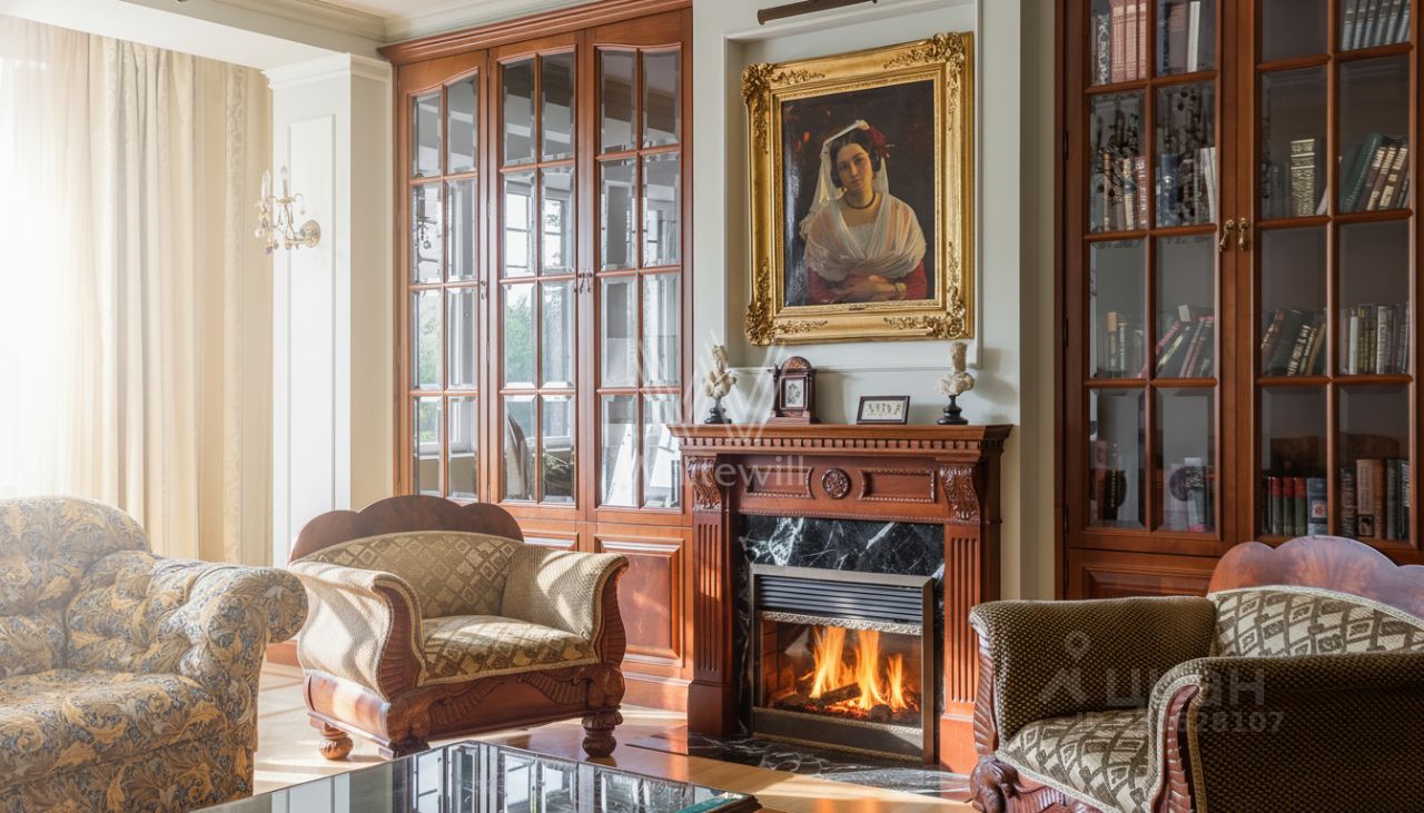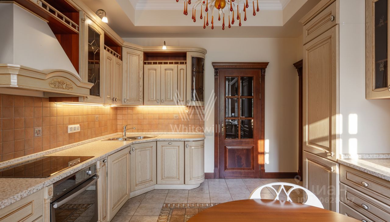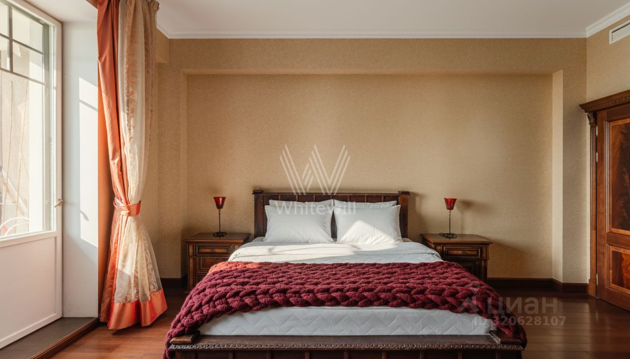 Квартира площадью 241 м² с зимним садом в комплексе ''Венский дом'' на втором этаже. Выполнен ремонт в классическом стиле, в отделке использовано натуральное дерево и камень. На полу выложен светлый паркет с плетёным узором. Стены в спокойных тонах украшены картинами и светильниками в виде подсвечников. Квартира полностью меблирована, почти вся мебель из тёмного дерева. В гостиной с витражными дверьми спланирована зона отдыха у камина, столовая зона с круглым столом на шесть персон. Оборудована кухня цвета слоновой кости с бытовой техникой. На застеклённой террасе обустроен зимний сад с мягкими диванами в леопардовой обивке.