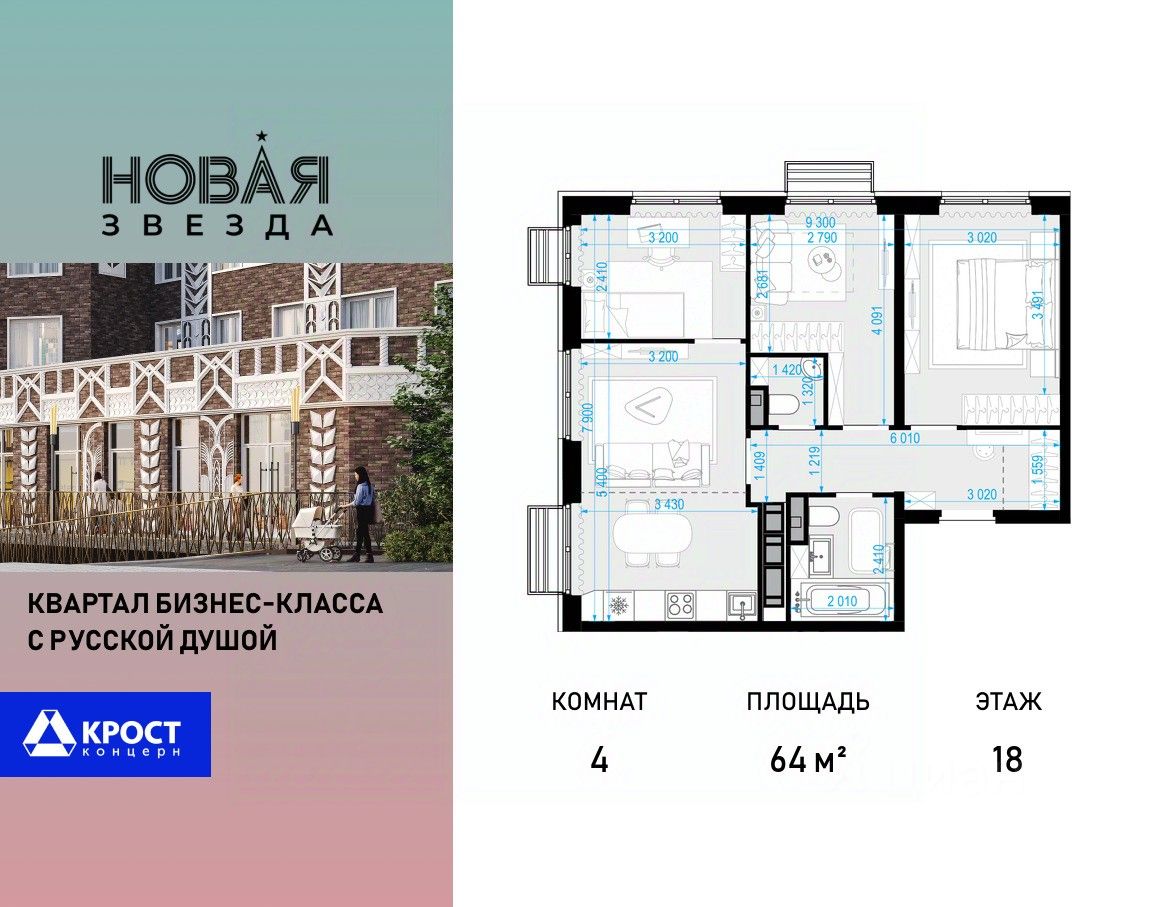 Прямая продажа от застройщика! Продаётся 4-к квартира 64 кв.м. в ''ЖК ''Новая Звезда'''' на 18-м этаже 22 этажного дома.