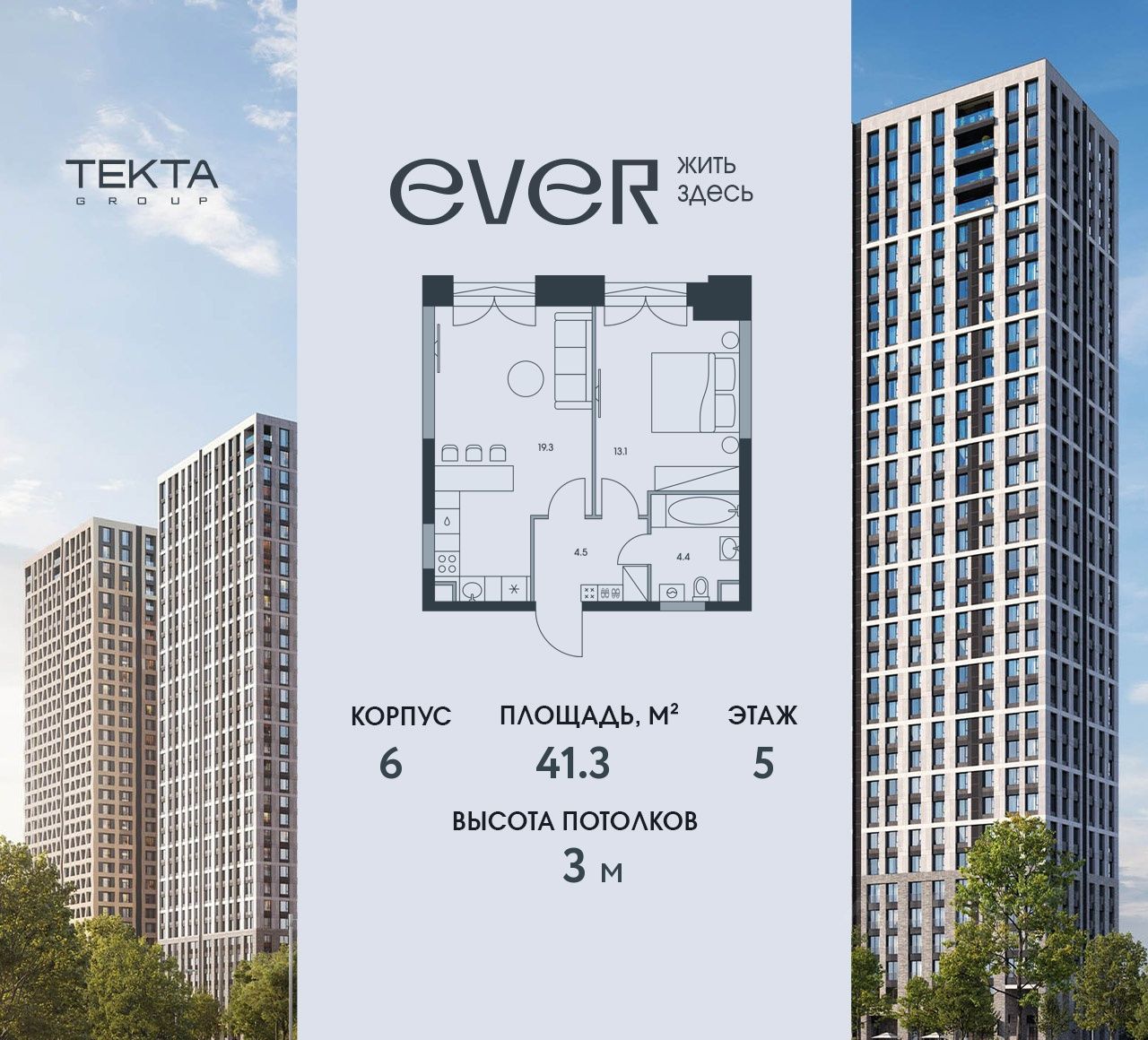 2-комн. квартира в ЖК ''Ever'' на 5 этаже в 34 этажном здании Корпус 6. Общая площадь: 41.3 кв.м., жилая: 22.9 кв.м. Высота потолков 3.00 м.