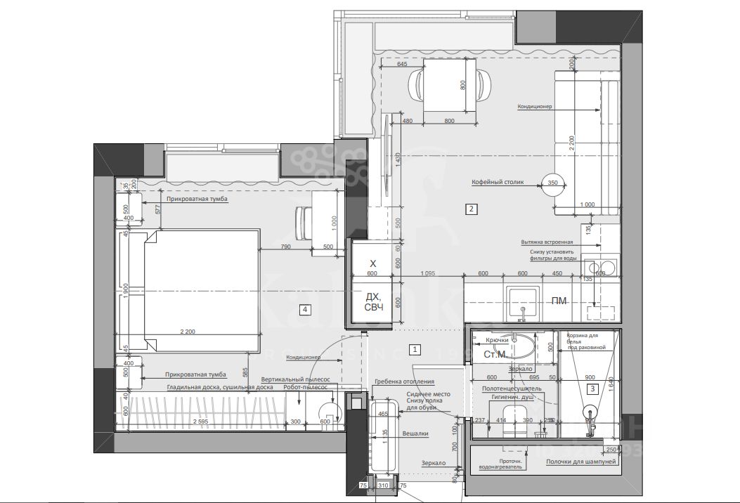 Планировочное решение включает: кухню-гостиную, спальню, гардеробную и совмещённый санузел.