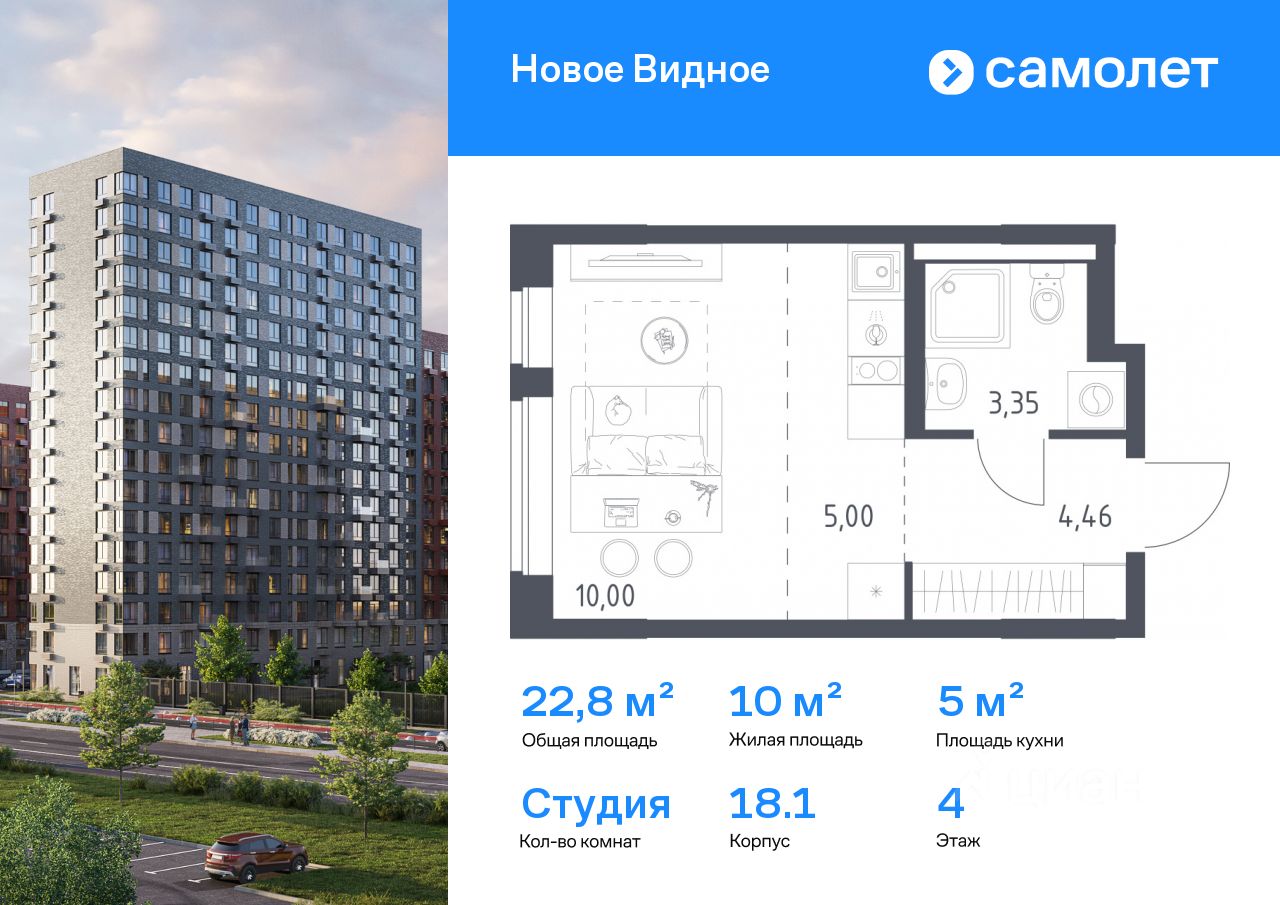 Строим кварталы для жизни с заботой о будущем. Предлагается квартира студия комфорт-класса 22,81 кв.м в корпусе 18.1 на 4 этаже, в ЖК ''Новое Видное'' Квартира с чистовой отделкой. Доступность дополнительных опций уточняйте у застройщика.