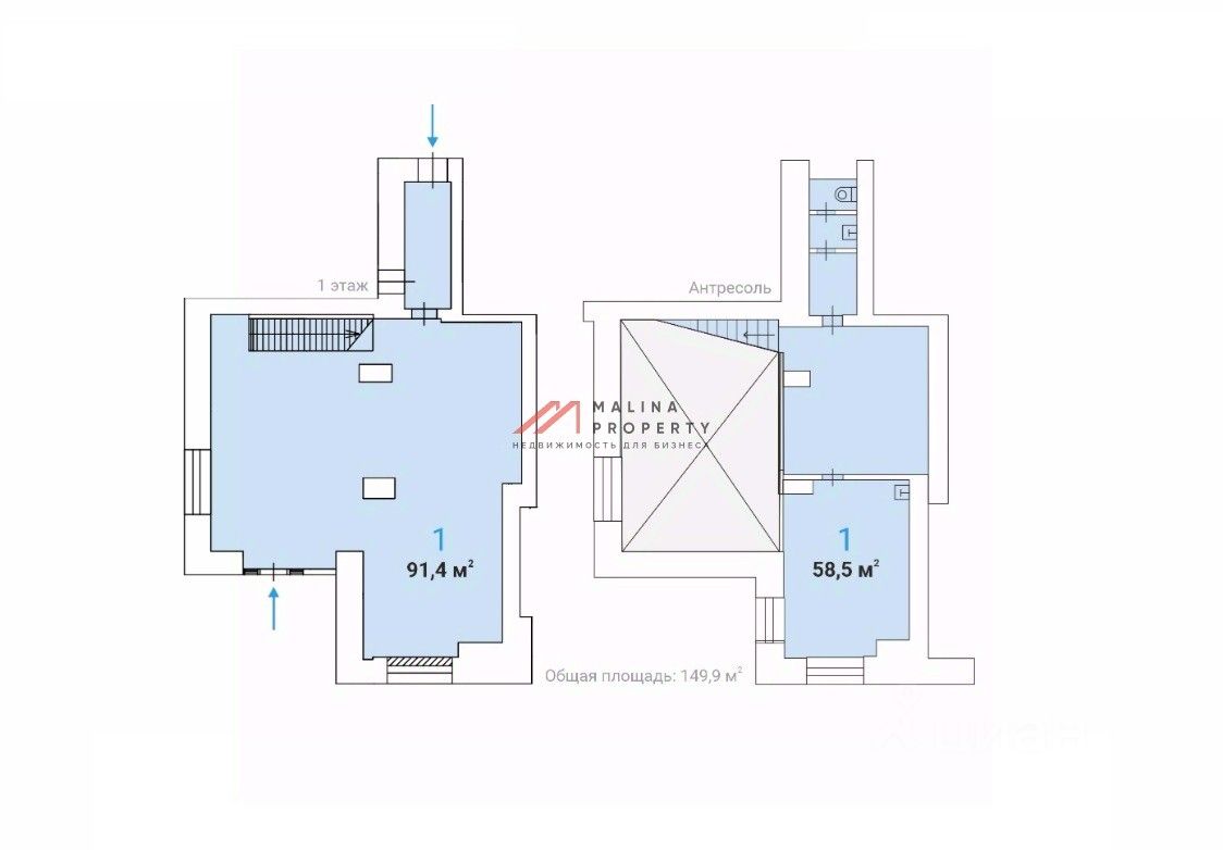Помещение общей площадью 149,9 м2, 1-й этаж 91,4 м2, антресоль 58,5 м2, открытая планировка, отдельный вход с фасада, высота потолка 2,3-4,9 м, витринные окна по фасаду. Место для размещения рекламы.