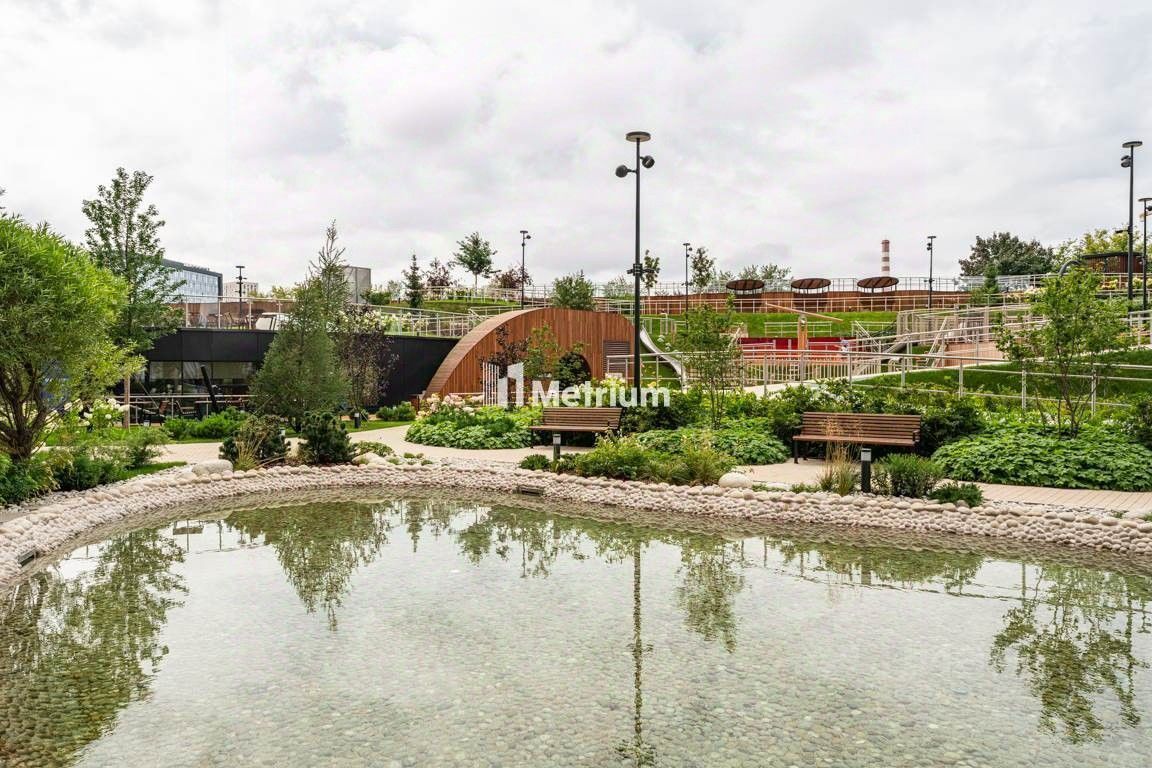 На площади 1,7 гектара создан живописный парк с террасным склоном, в котором растут луговые травы, кустарники и деревья. Пространство ландшафтного двора-парка разделено на зоны для активного и спокойного отдыха с зелеными уголками для любителей тишины.