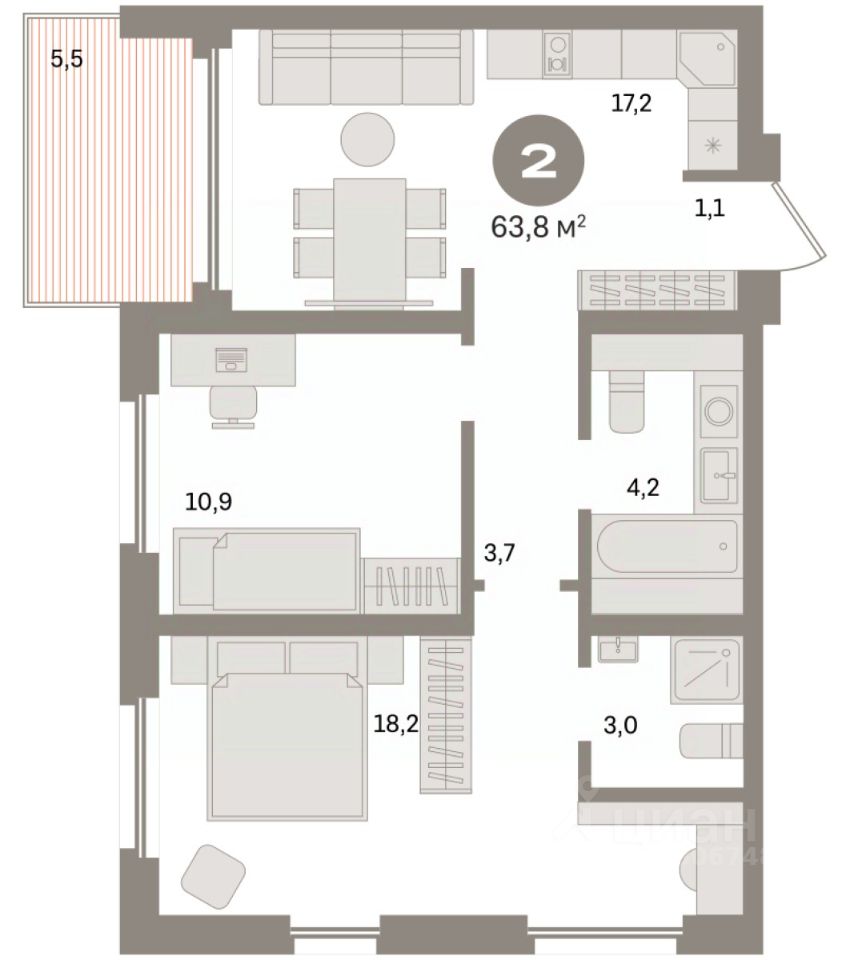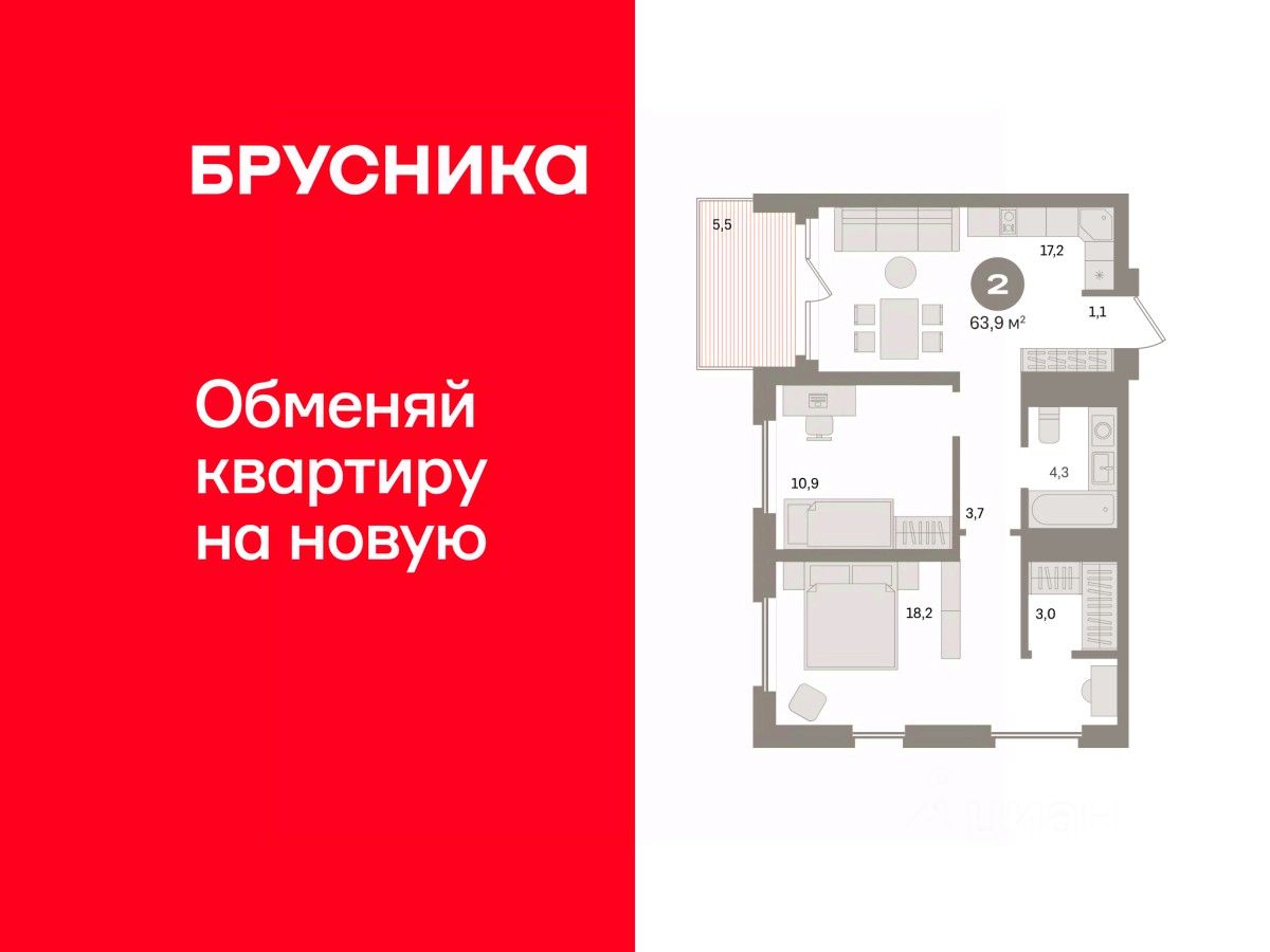 Квартира с кухней-гостиной и двумя спальнями в Южных кварталах. Особенности планировки: балкон, предчистовая отделка. квартиры в нашей базе: ЮК04-А1-9-9.15.11.