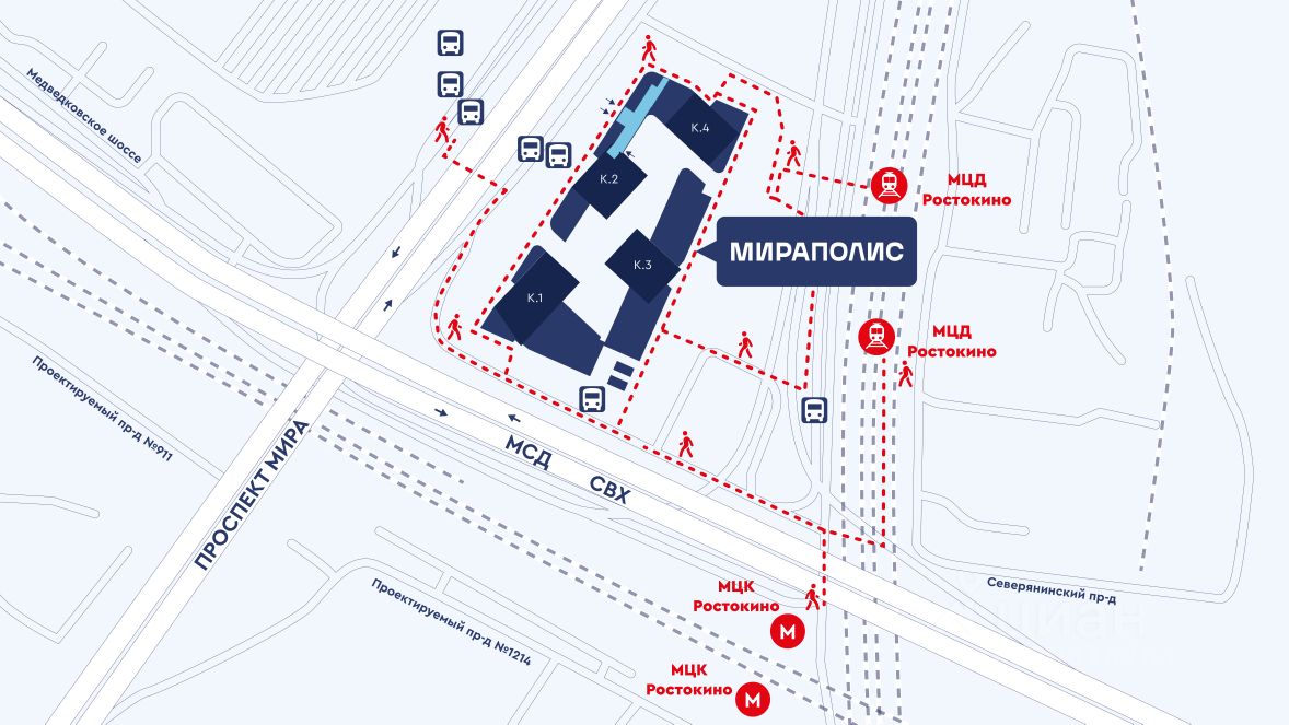 МИРАПОЛИС состоит из 4-х небоскребов высотой 33-35 этажей. Расположен на проспекте Мира — крупной московской магистрали. По ней 8,2 км до Третьего транспортного и 11,5 км до Садового кольца. Рядом с кварталом проходит Московский скоростной диаметр (МСД). Высокая проходимость благодаря пассажиропотоку ТПУ Ростокино - на данном участке сосредоточены потоки транспорта и пешеходов, пересадка с МЦД на МЦК. Удобная локация в 5 минутах на машине от станции метро ''ВДНХ'', в 400 м от МЦК ''Ростокино'' и быстрый выезд на главные транспортные магистрали позволяет всего за 30 мин. добраться до центра Москвы. Наземный транспорт ходит в Медведково и Останкино, до станций метро ''ВДНХ'', ''Красносельская'', ''Сокольники'', ''Преображенская площадь''.