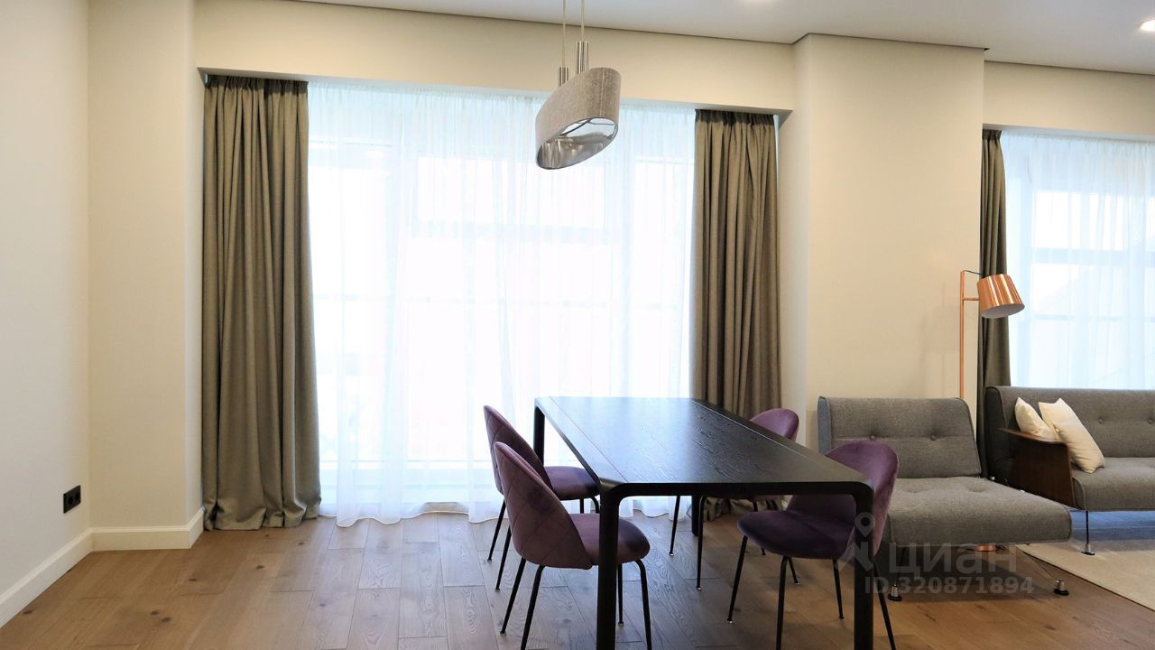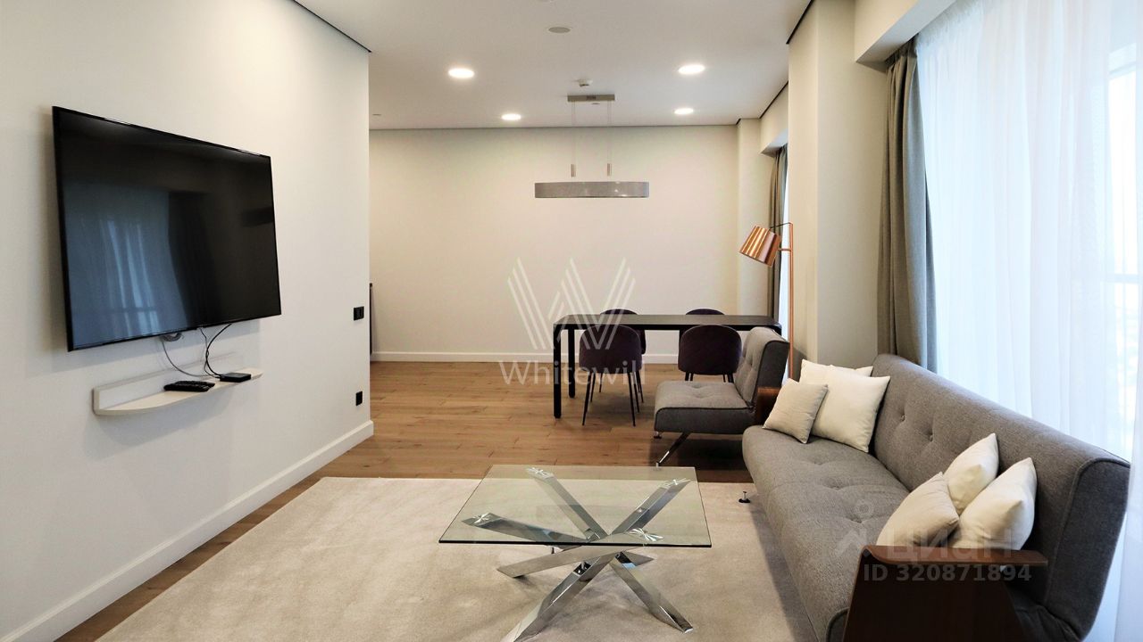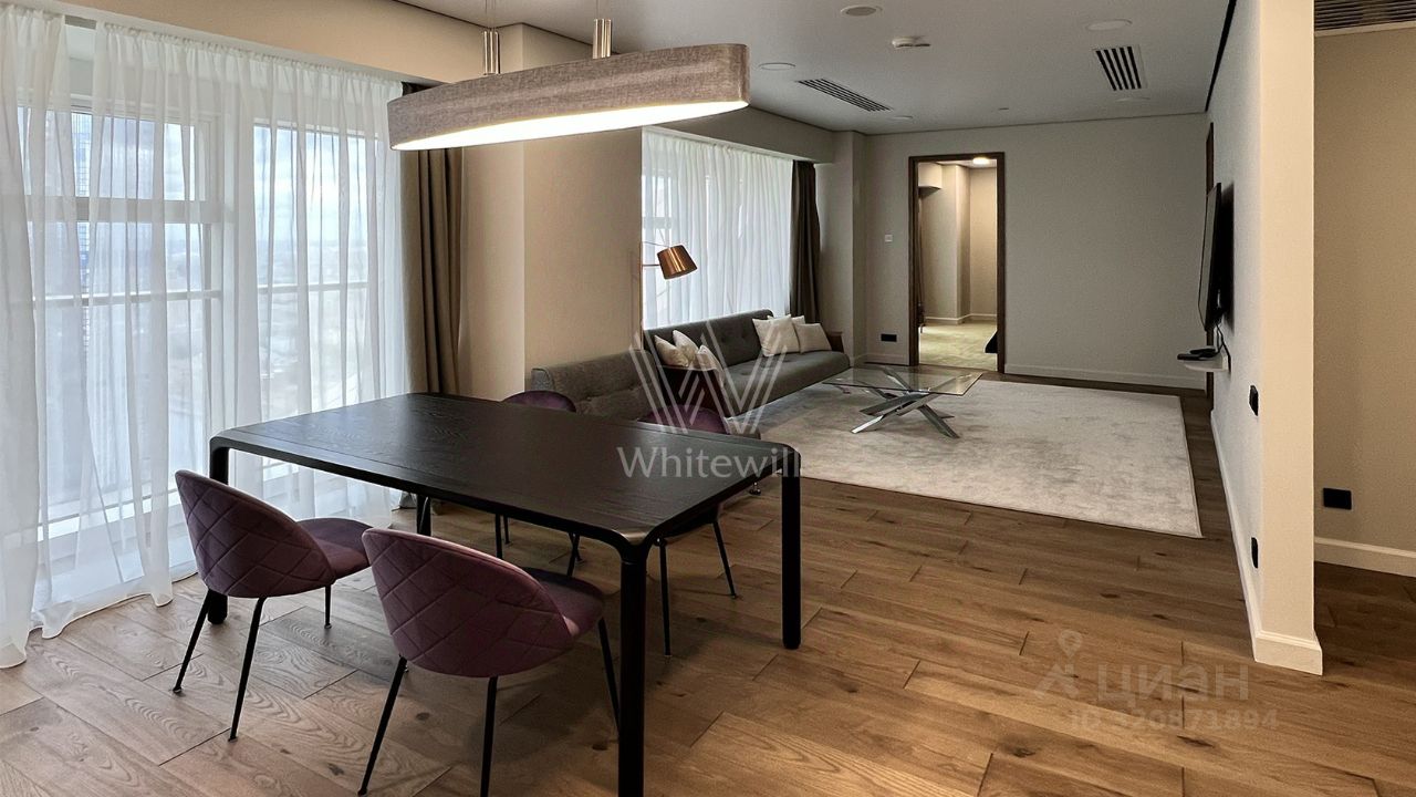Апартаменты с 1-й спальней общей площадью 98 м² в башне ''Меркурий'' в деловом центре ''Москва-Сити''. Выполнена премиальная отделка в современном стиле. Благодаря панорамным окнам пространство наполнено светом, открываются виды на город. Спланирована кухня-гостиная с обеденной зоной, мастер-спальня с собственным санузлом с душевой, гостевой санузел, гардеробная, постирочная, прихожая. Апартаменты полностью меблированы и укомплектованы бытовой техникой, установлена система кондиционирования.