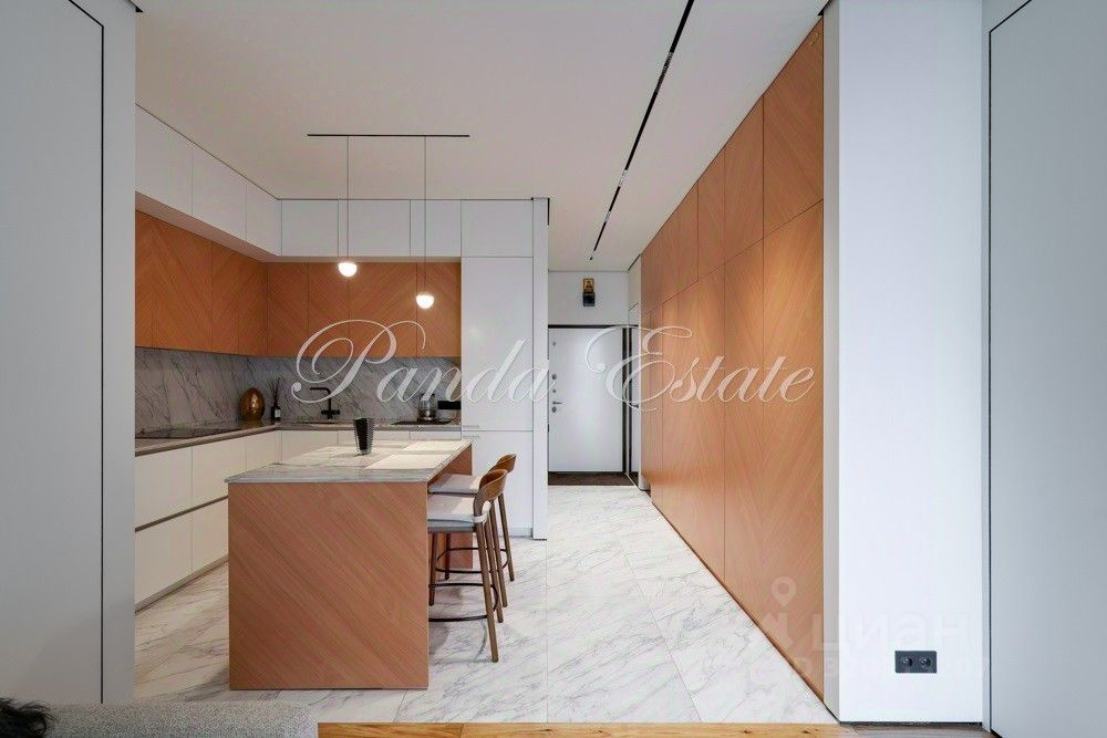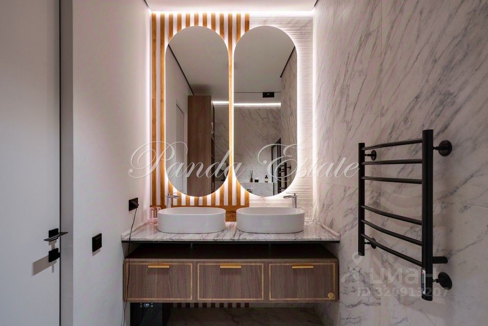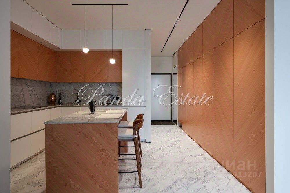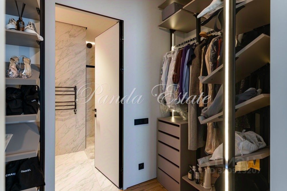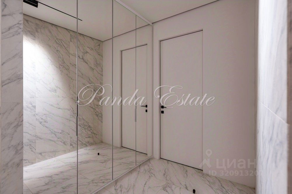 Входную дверь меняли, внешне как у застройщика, но по качеству неприступная. В отделке использованы премиальные материалы: шпон, мрамор, широкоформатный керамогранит. Двери высокие до потолка, дизайнерская мебель Ferre, Cavalli.