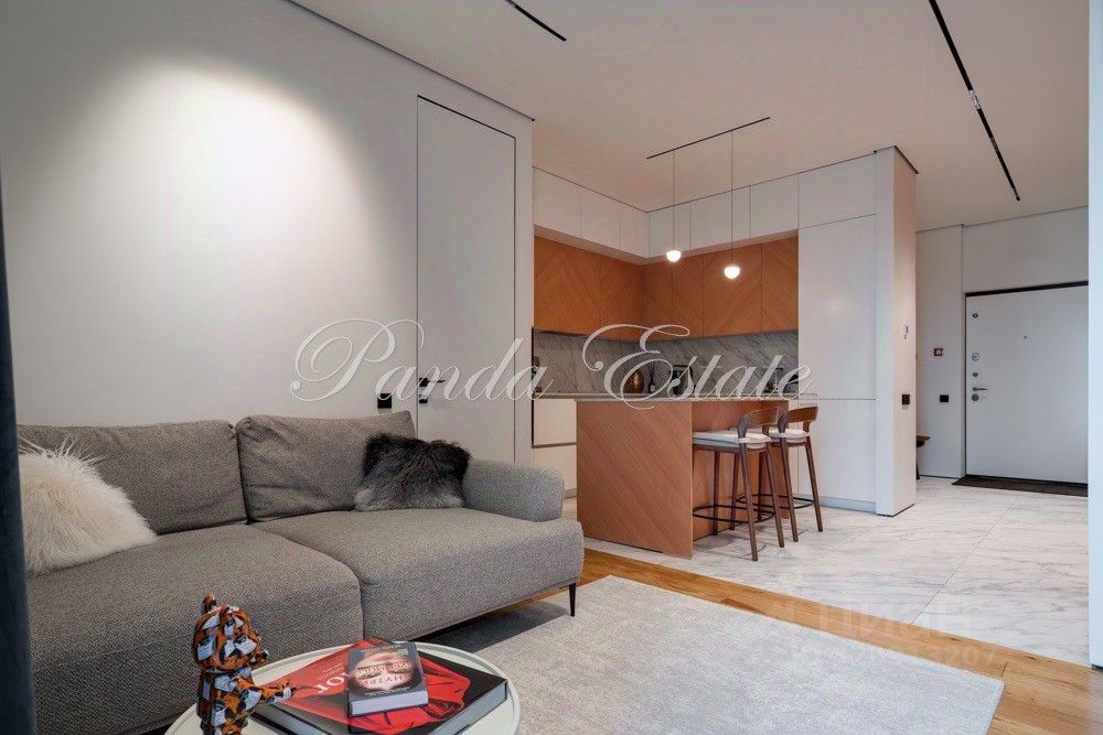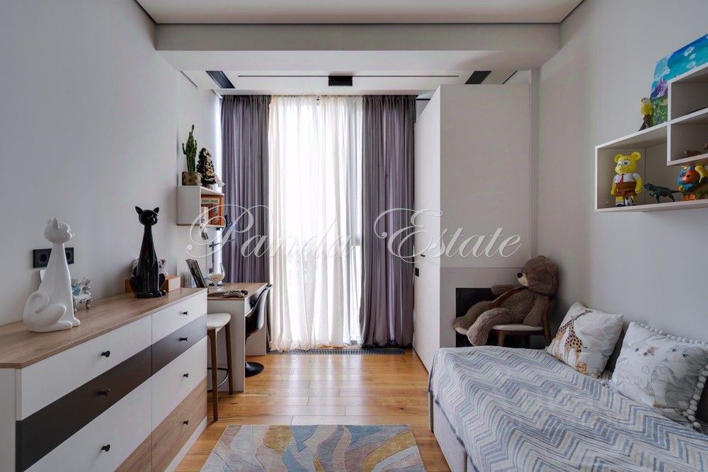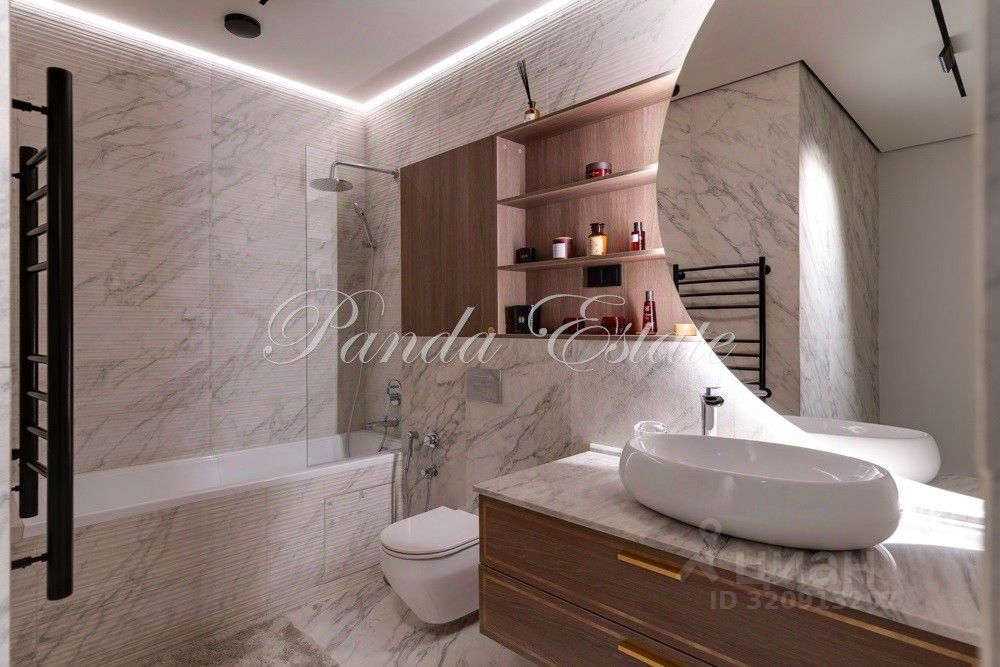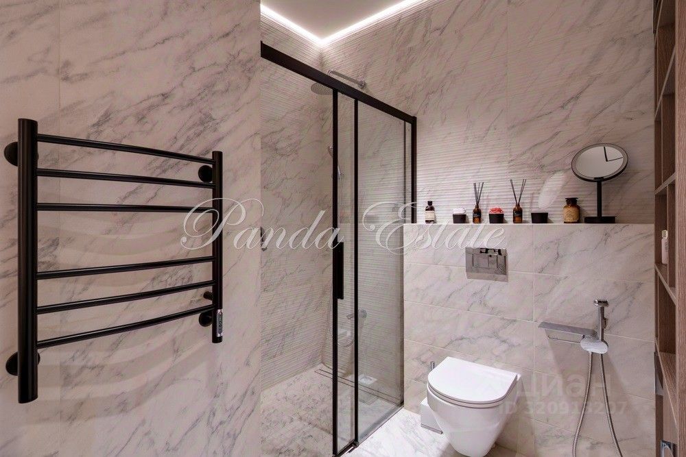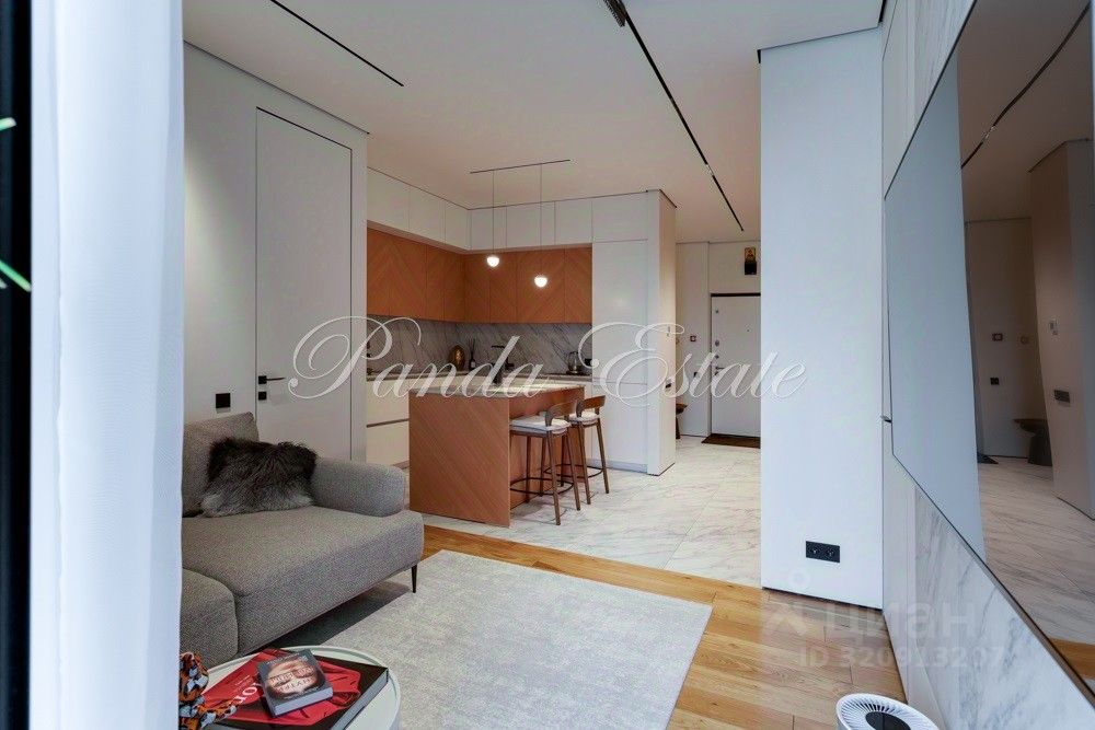 Входную дверь меняли, внешне как у застройщика, но по качеству неприступная. В отделке использованы премиальные материалы: шпон, мрамор, широкоформатный керамогранит. Двери высокие до потолка, дизайнерская мебель Ferre, Cavalli.