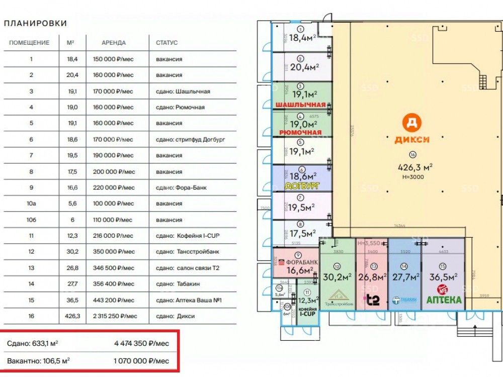 Коммерческие условия: Прогнозируемый МАП на 1-й год - 5 640 000 рублей Прогнозируемый ГАП на 2-й год - 71 064 000 рублей Прогнозируемый ГАП на 3-й год - 74 617 200 рублей Текущие арендаторы (571.4 кв.м.): продовольственная сеть ''Дикси'', StarDogs, Аптека, Теле2, Табак и другие текущий МАП 4.474.350 рублей Вакантно: 106,5 м2 по ставке 1 070 000 ?/мес Стоимость объекта - 690 000 000 рублей Стоимость за кв.м. - 929 600 рубля Продажа по ДКП от юр. лица на УСН