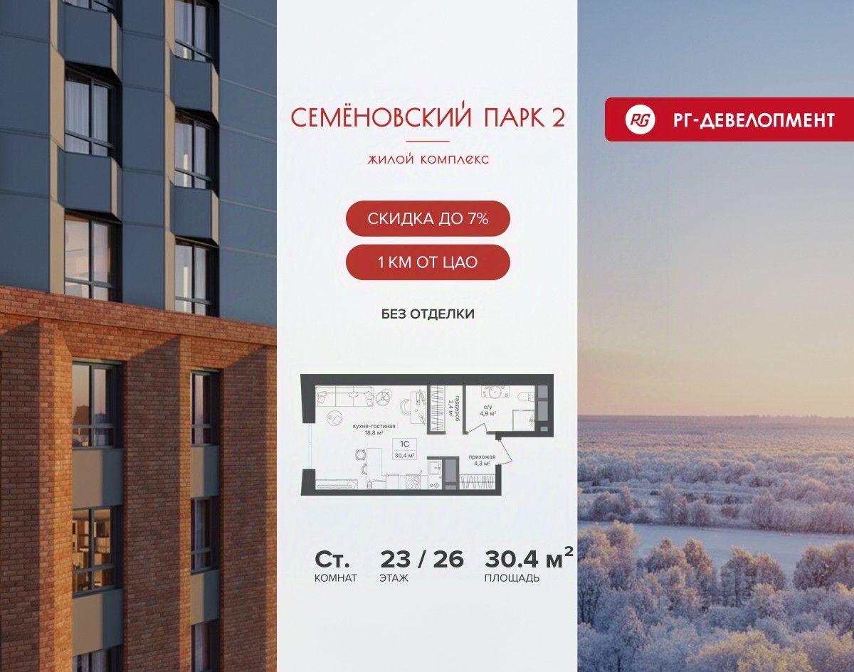 Продается студия 30,4 кв.м. в ЖК ''Семеновский парк 2'' на 23-м этаже 26 этажного дома.