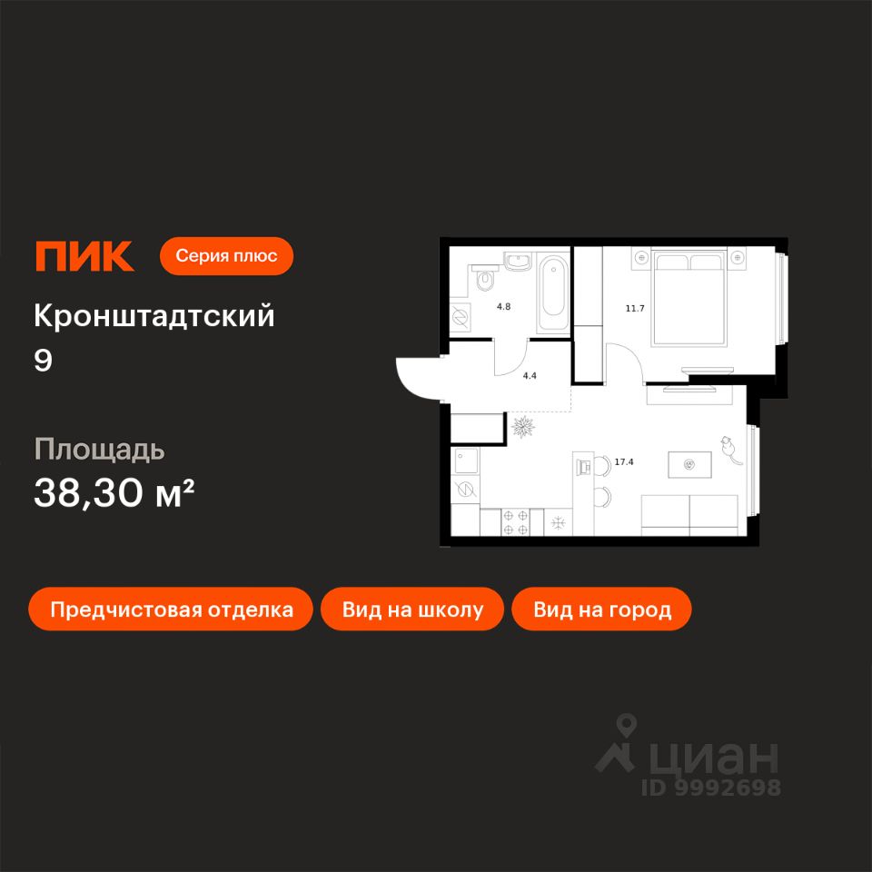 Продаётся 1-комн. квартира площадью 38,3 кв.м на 8 этаже 12 этажного дома (Корпус 1.1.2, Секция 2) проекта ПИК Кронштадтский 9. Светлый просторный подъезд на уровне земли, функциональная планировка, большие окна, предчистовая отделка.