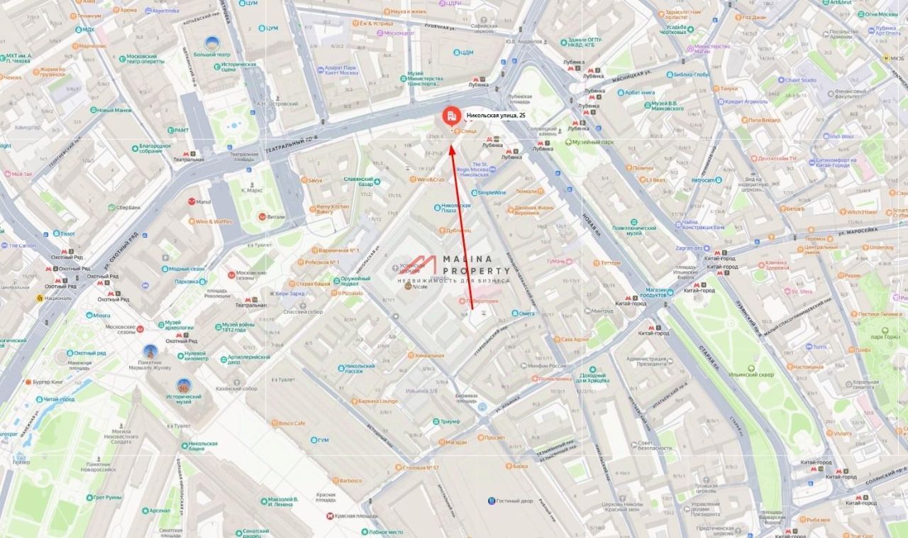 Помещение располагается в историческом и деловом центре, рядом метро. Интенсивный пешеходный трафик вдоль помещения. Окружение: ''Центральный детский магазин'', торговый и офисный центр ''Никольская Плаза'', гостиницы ''St. Regis Moscow Nikolskaya'' и ''Метрополь'', Красная Площадь, ГУМ, ЦУМ и др.
