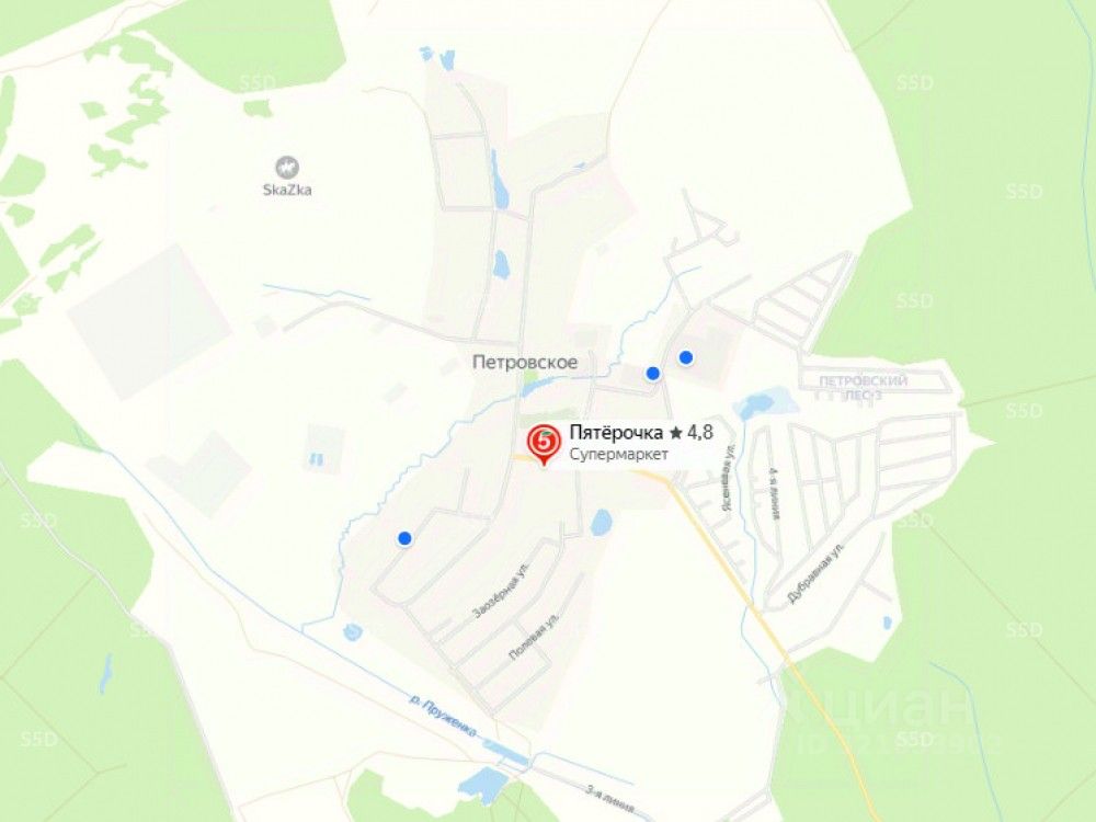 Земельный участок находится прямо на въезде в три поселка общей численностью 750 домовладений, так же эта единственная дорога, ведет к Петровскому и еще 6 поселкам, численностью до 1500 участков. Ритейл слабо представлен - одной Пятерочкой и тремя местными лавками (фото 3)