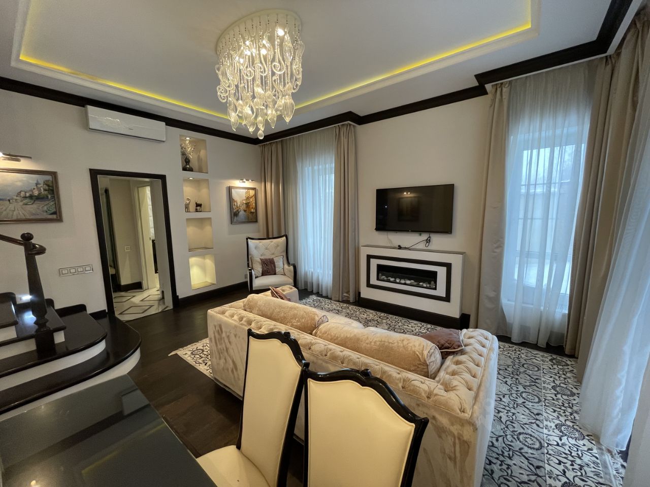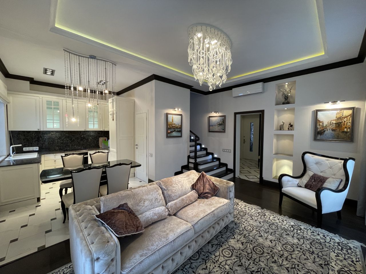 Охраняемый коттеджный поселок Вилла Нова, таунхаус 220 кв.м, 3 уровня, современный ремонт, дорогая мебель и материалы отделки. 1 эт: прихожая, с/у, гостиная, выход из гостиной на участок, кухня (из кухни есть дверь в подсобное помещение, где расположен второй холодильник, небольшая кладовая, 2 эт: хоз. спальня с выходом на балкон, с/у с двухместной ванной у окна и душевой кабиной, дополнительная комната, гардеробная. 3 эт: детский этаж - две спальни и небольшая комната для няни, с/у +ванна+душ, Мансарда: встроенные шкафы по периметру этажа, много естественного света - широкие мансардные окна, можно оборудовать под кабинет или игровую зону для детей. Парковка.