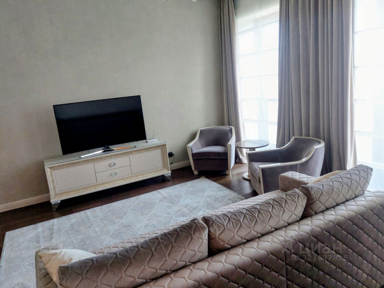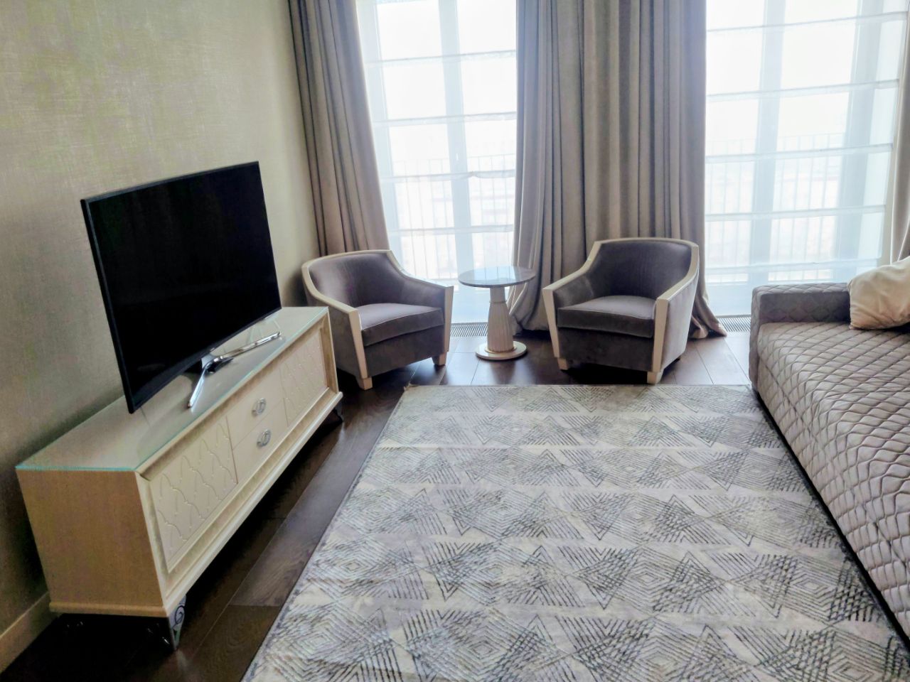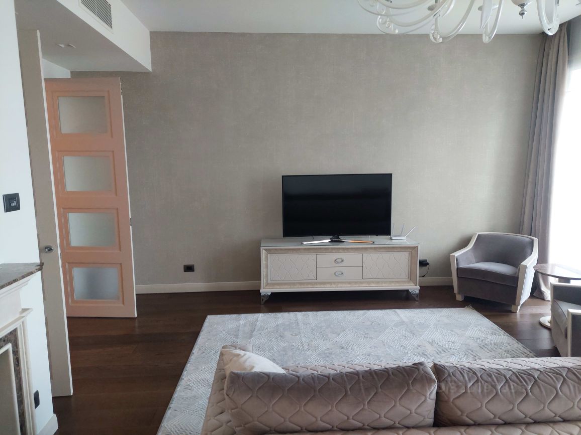 Прекрасный апартамент с дизайнерской отделкой. Очень удобная планировка: общая зона кухни с гостиной-столовой, отдельная спальня, два сан.узла, большая гардеробная, функциональная постирочная. Полностью укомплектован качественной мебелью, всей необходимой бытовой техникой, в том числе и мелкой (от СВЧ до кофеварки), установлена посудомоечная машина. В каждой комнате есть своя система кондиционирования, шторы на окнах как лёгкие, так и плотные, управление которыми осуществляется с пульта. Апартамент находится в корпусе Hyatt Regency. Жильцам этого корпуса доступны все удобства и сервисы 5* отеля. Также доступна и подземная парковка, но за отдельную плату.