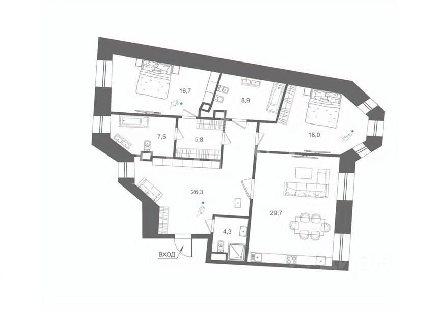 Квартира без отделки. Возможная планировка: кухня-гостиная, две спальни, одна из которых со своим санузлом и гардеробной, совмещенный санузел, гостевой санузел, прихожая.