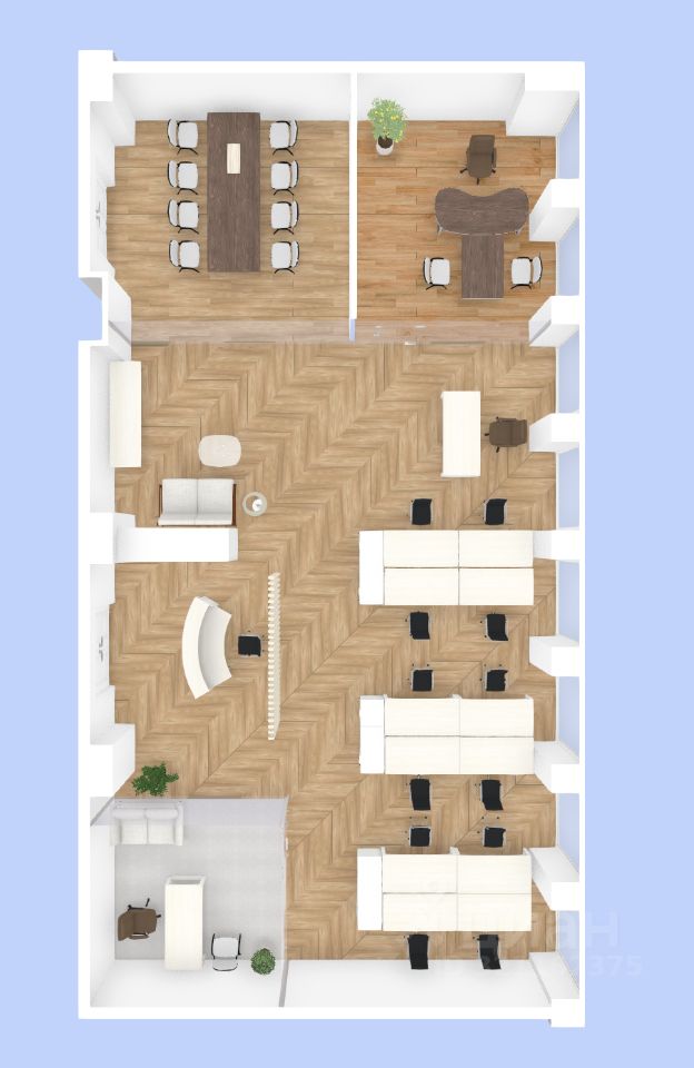 Вы получаете чистую бетонную коробку и выполняете ремонт по собственному или нашему дизайн-проекту (оптимальная планировка до 20 сотрудников).