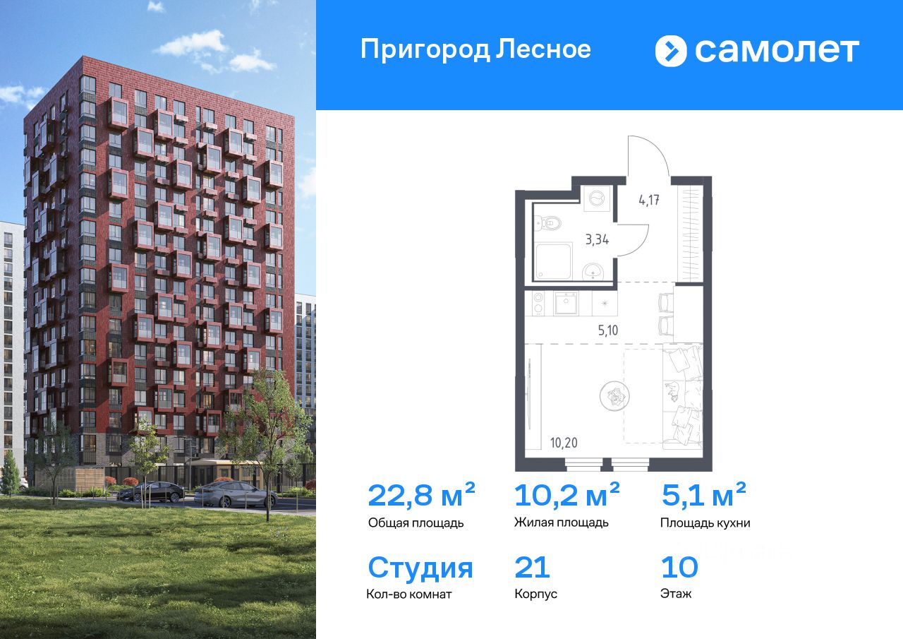 Предлагается квартира студия комфорт-класса 22,81 кв.м в корпусе 21 на 10 этаже, в ЖК ''Пригород Лесное'' Квартира без отделки. Доступность опции ''отделка'' и возможность комплектации мебелью и декором уточняйте у застройщика.