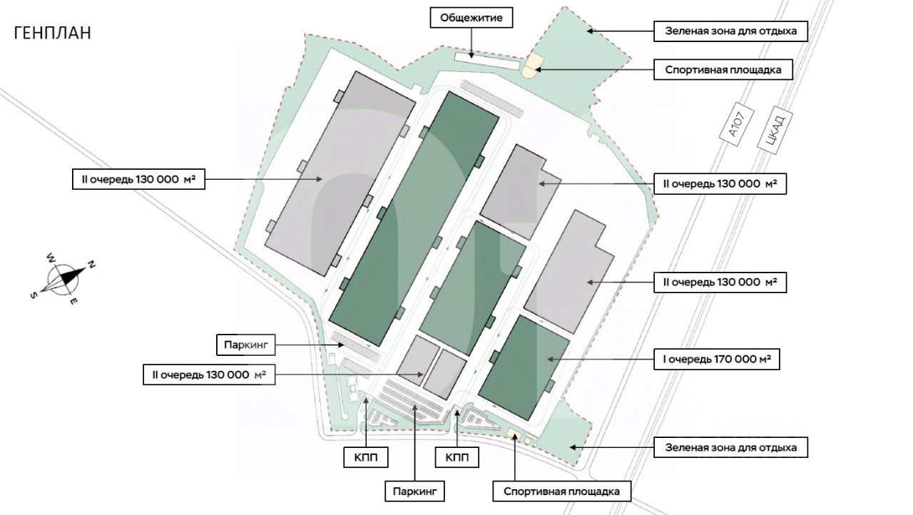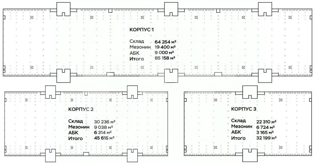 Общая площадь: 162 972 кв. м Склад: 109 331 кв. м Офис: 18 479 кв. м Мезонин: 35 162 кв. м