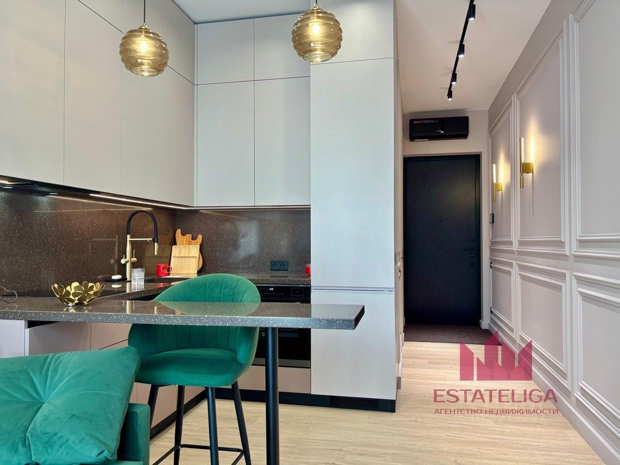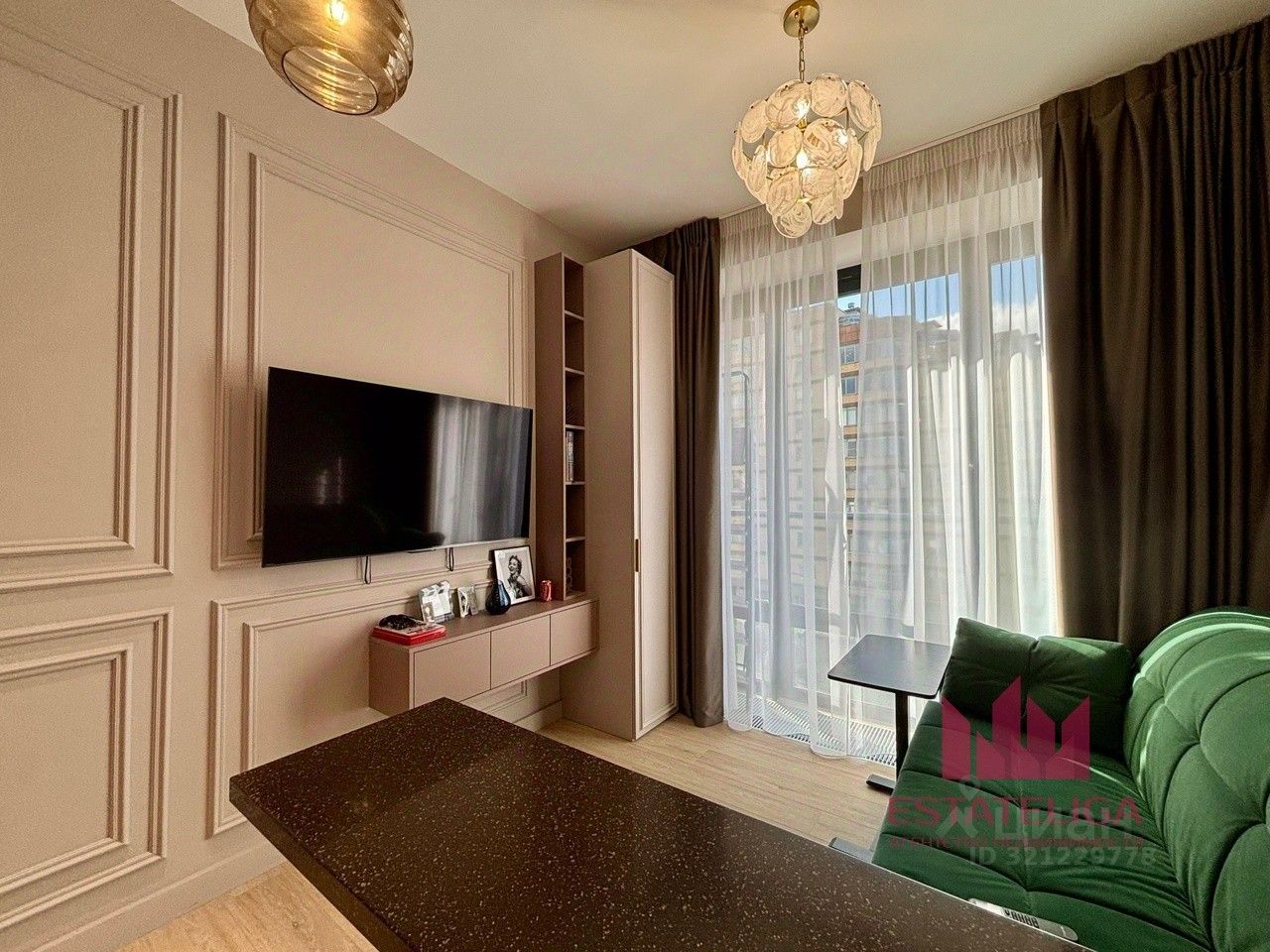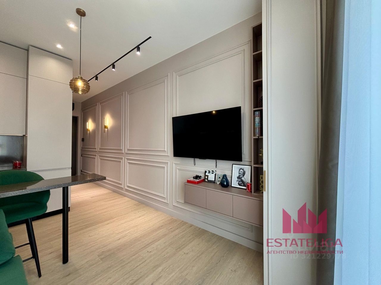 В классической студийной планировке выполнен ремонт из премиальных материалов