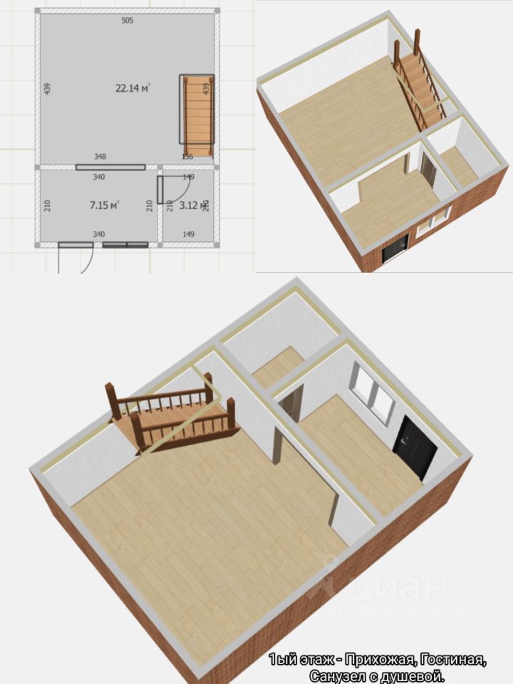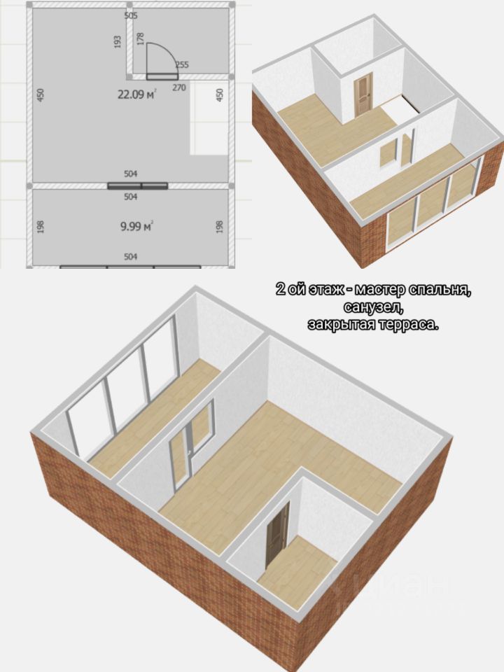 Планировка: 1 этаж- Объемная прихожая, Кухня-Гостиная-22 кв.м., санузел. 2ой этаж- Спальня 15кв.м. с гардеробной комнатой 5кв.м., санузел, выход на зимний сад. 3ий этаж-Мансардный-15кв.м., возможно использовать как гардеробную, спальню.
