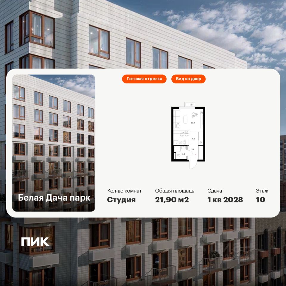 Продаётся квартира-студия площадью 21,9 кв.м на 10 этаже 15 этажного дома (Корпус 16.1, Секция 4) проекта ПИК Белая Дача парк. Светлый просторный подъезд на уровне земли, функциональная планировка, большие окна, c отделкой.