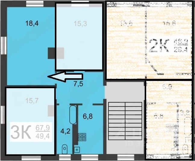 В квартире проживает один сосед. Беспроблемный, готовый вместе с новыми жильцами совместно сделать ремонт.