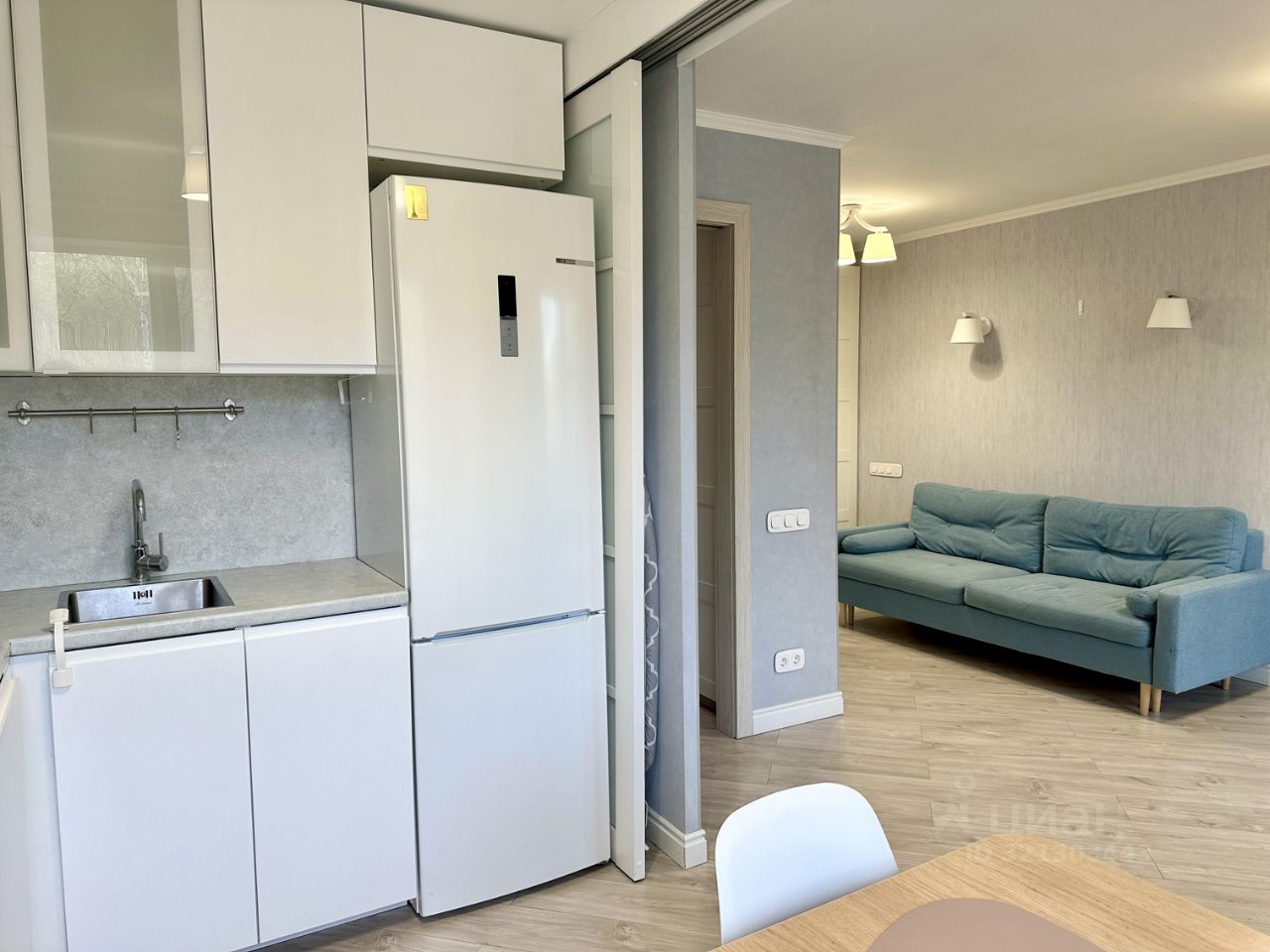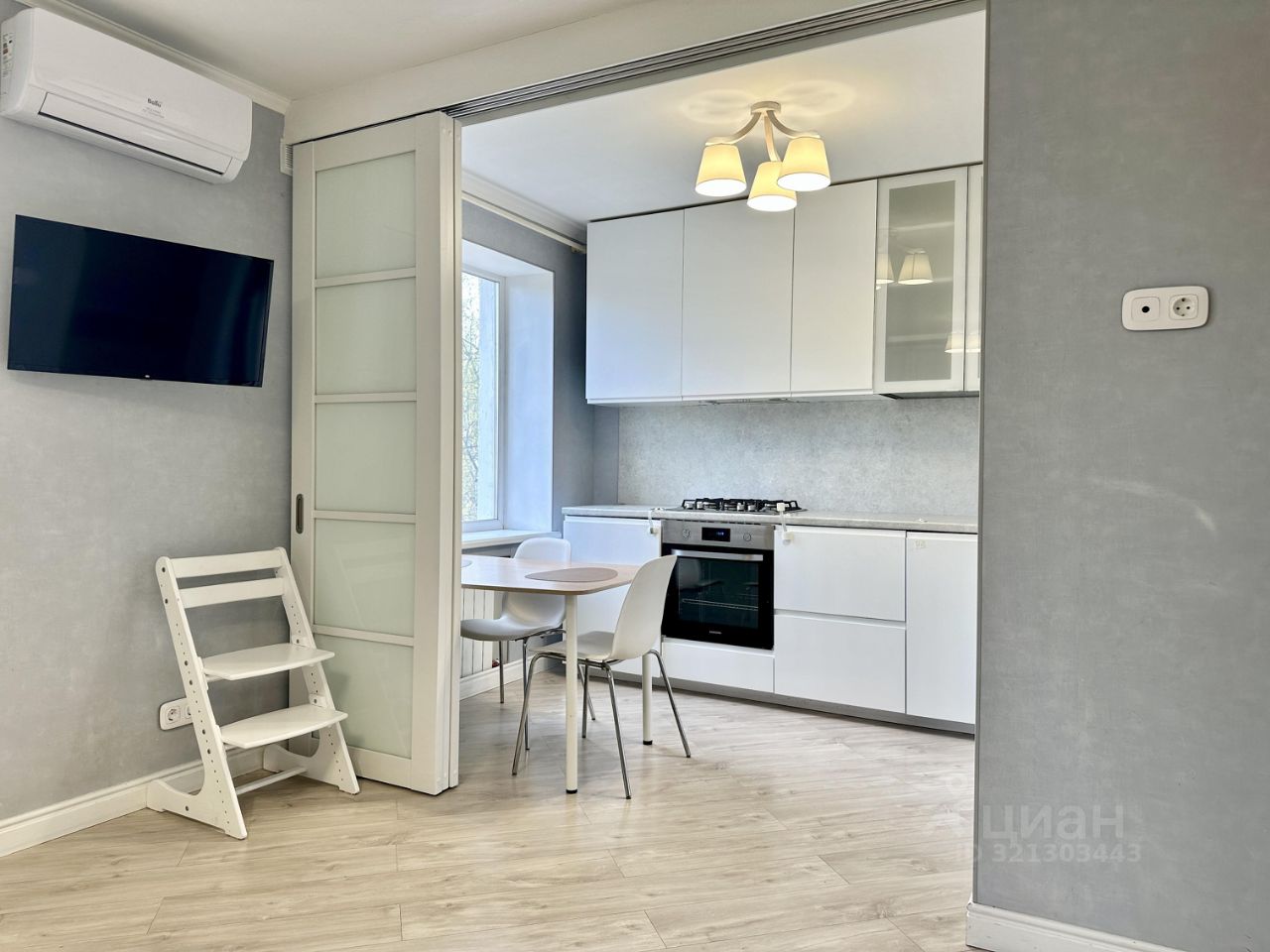 Комнаты СМЕЖНЫЕ. Уютная кухня со встроенной бытовой техникой, для удобства отделена от комнаты раздвижной дверью-купе.