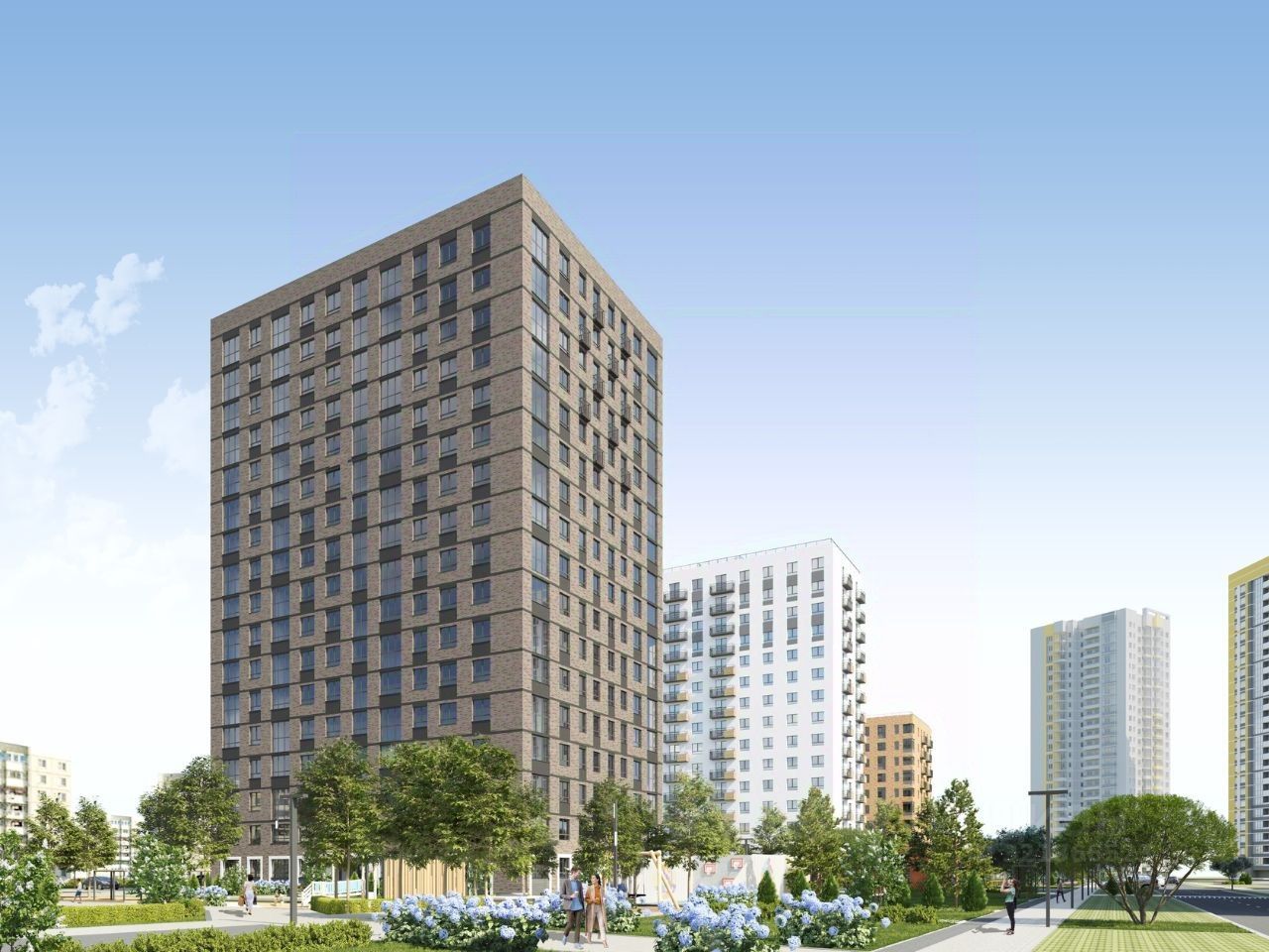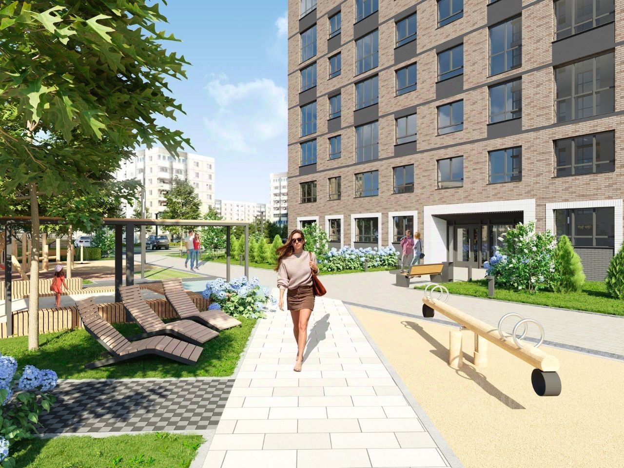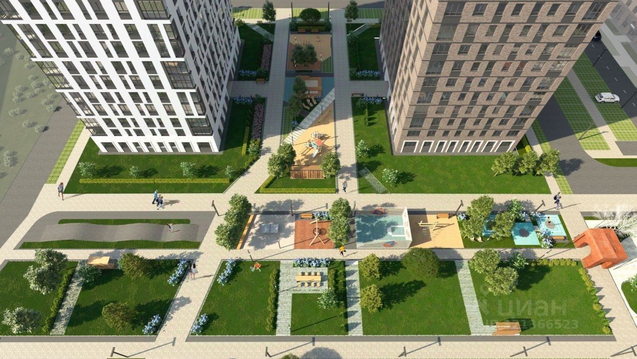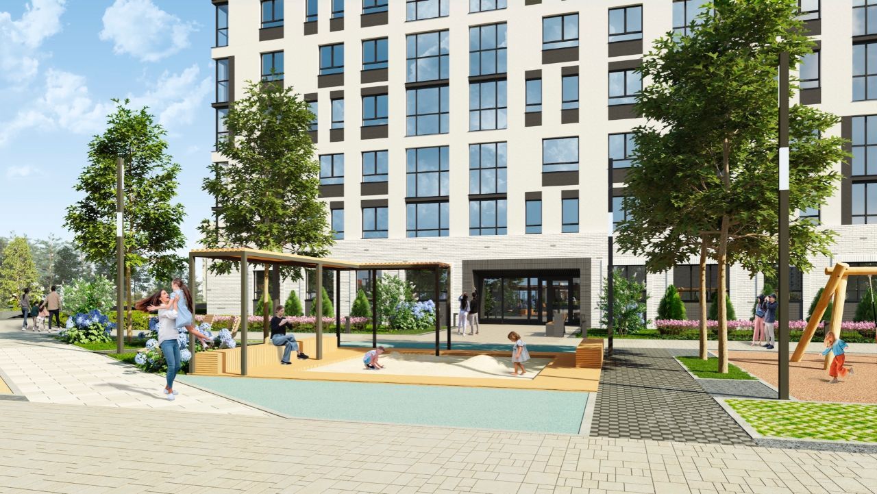 В проекте жилого комплекса мы предусмотрели большое количество детских и спортивных площадок, зеленую аллею для прогулок с элементами ландшафтного дизайна, широкие дворовые проезды, новый, расширенный пакет системы ''Умный дом''.