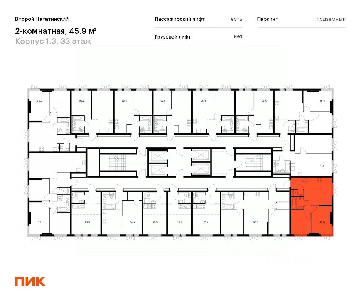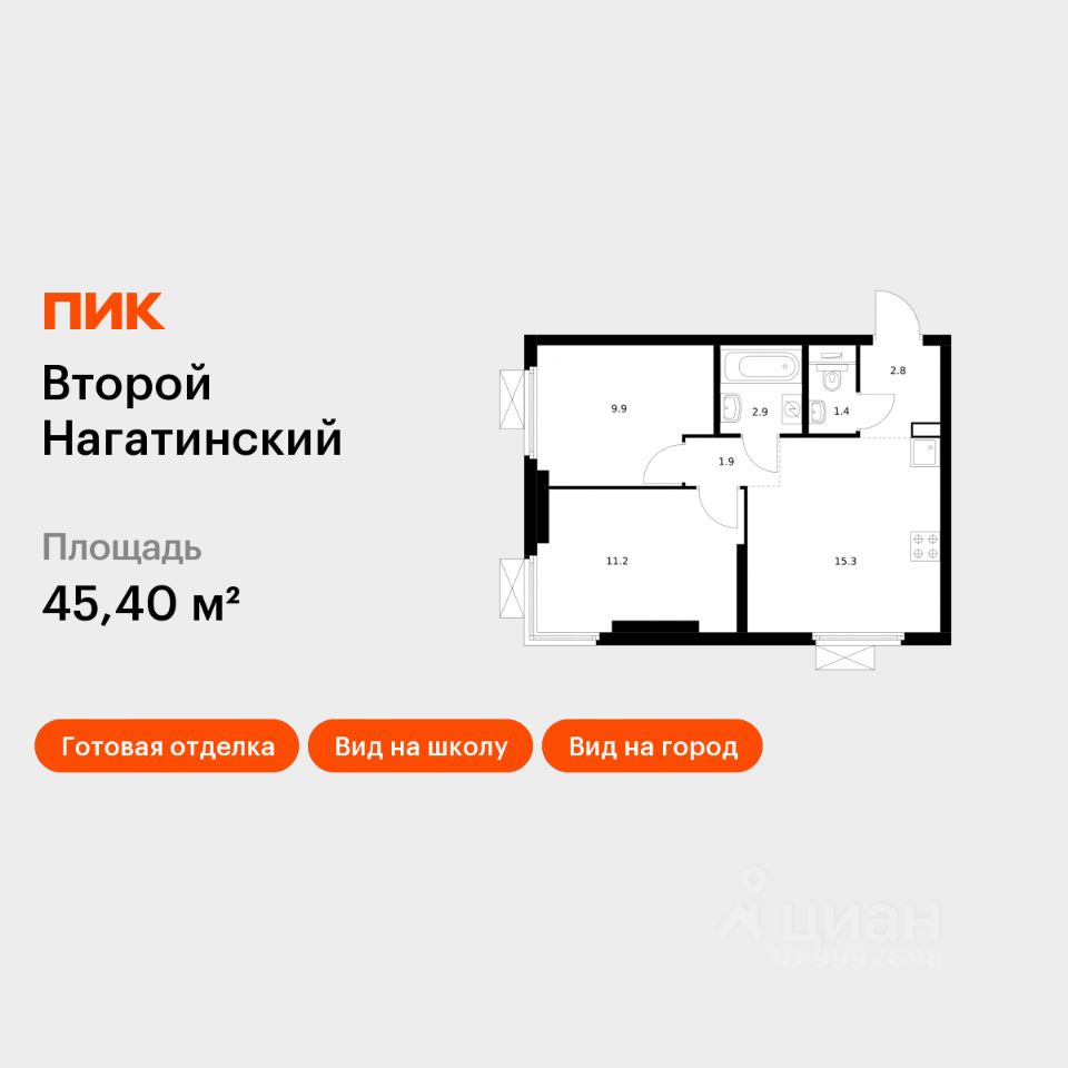 Продаётся 2-комн. квартира площадью 45,4 кв.м на 33 этаже 33 этажного дома (Корпус 1.3, Секция 3) проекта ПИК Второй Нагатинский. Светлый просторный подъезд на уровне земли, функциональная планировка, большие окна, c отделкой.