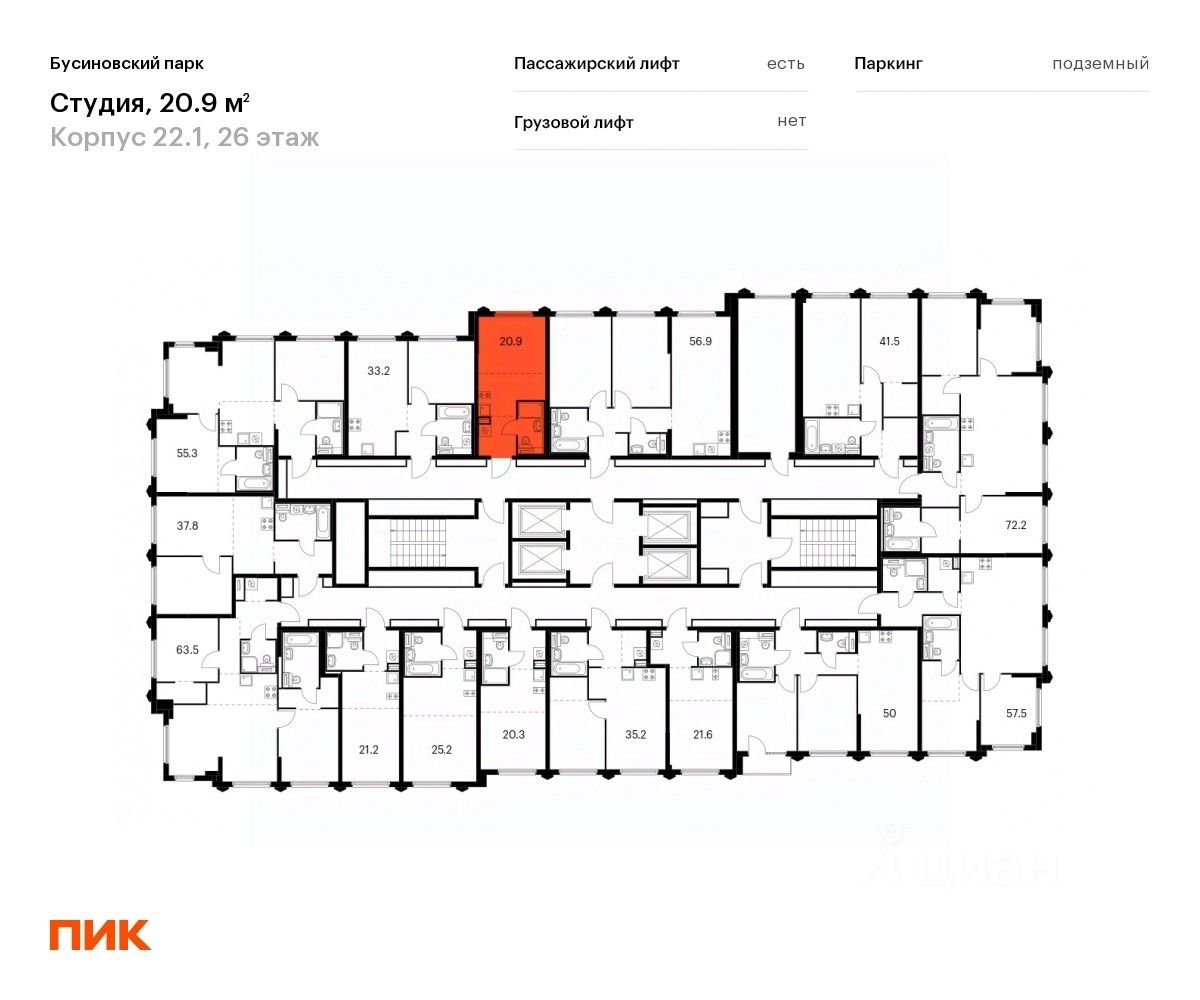 Продаётся квартира-студия площадью 20,9 кв.м на 26 этаже 32 этажного дома (Корпус 22.1, Секция 1) проекта ПИК Бусиновский парк. Светлый просторный подъезд на уровне земли, функциональная планировка, большие окна, c отделкой.
