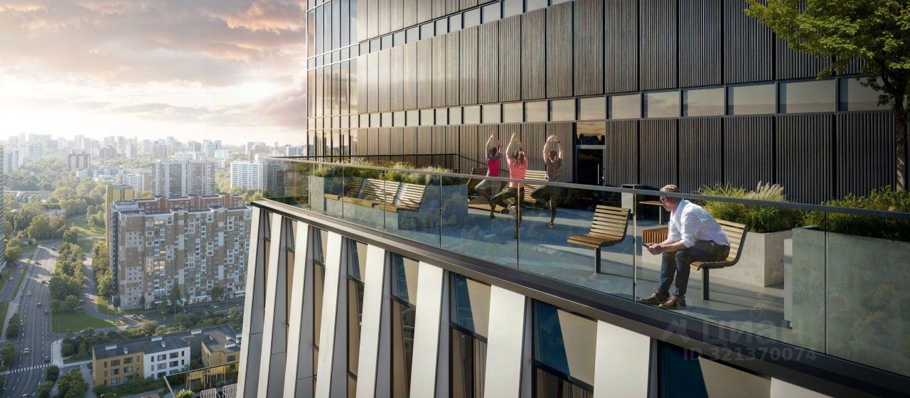 В корпусе 1.4 появится общественная терраса на 30-м этаже. Доступ сюда есть только у жителей, поэтому вы не встретите в этом пространстве посторонних людей. Здесь можно заниматься спортом, отдохнуть за чтением книги или создать собственный сад. А ещё отсюда открываются красивые виды на город.