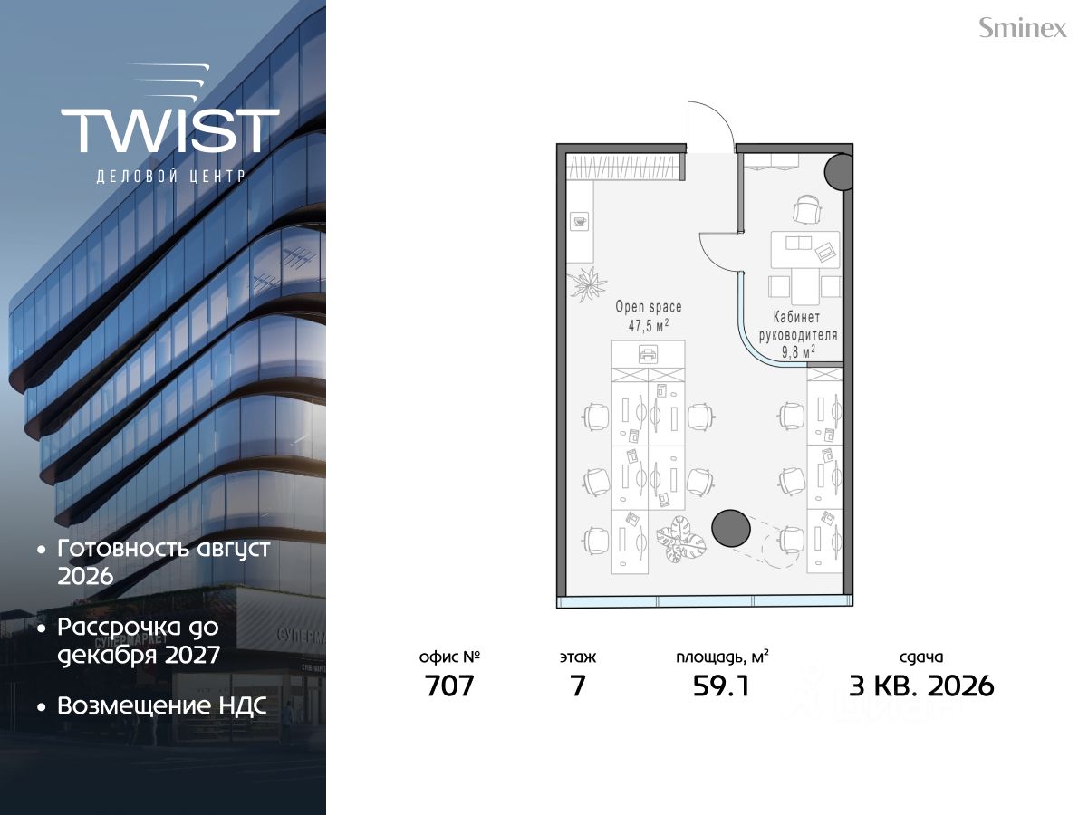 Готовность в августе 2026. Рассрочка до декабря 2027. Видовой офис площадью 59.1 кв. м. с панорамным остеклением ориентирован на улицу Нижняя Масловка. Свободная планировка и минимальное количество несущих конструкций позволяют максимально эффективно зонировать пространство. Панорамное остекление обеспечивает максимальное количество естественного освещения в дневное время и динамичный вид на город в вечернее.