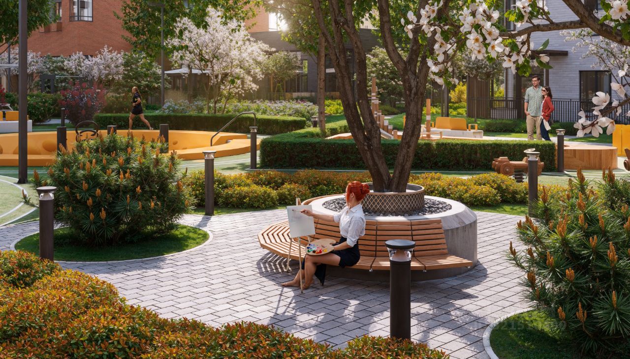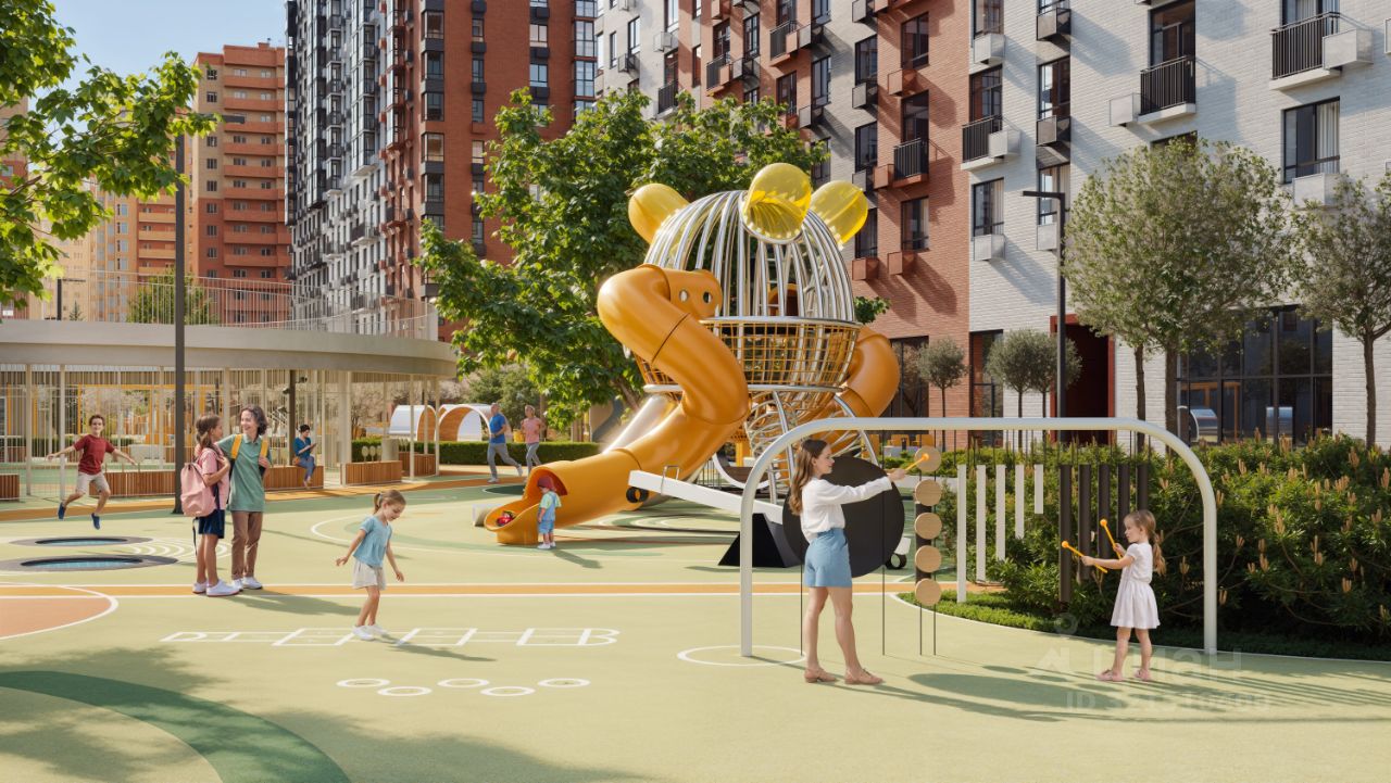 Благоустроенный двор-парк площадью 10 000 кв.м.: • Игровые площадки для детей всех возрастов и летний кинотеатр. • Отсутствие машин во дворе для безопасности детей и взрослых. • Подземный паркинг и большая наружная парковка. • Зоны воркаута. • Фонтан, амфитеатр, лабиринт и автогородок. • Отдельно выделенный участок для выгула питомцев за пределами двора.