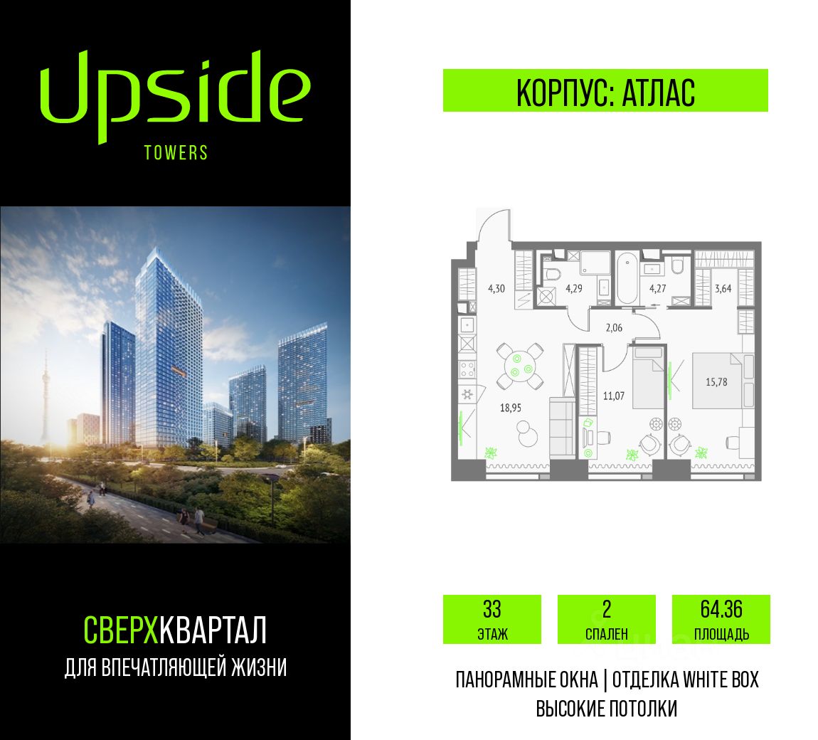Продаётся 2-комнатная квартира площадью 64.36 кв.м на 33 этаже 47 этажного корпуса Атлас в квартале небоскребов ''Upside Towers''. В квартире отделка White-box, c видом на внутренний двор, ландшафтный парк, парк Сокольники. Номер квартиры Б3311.