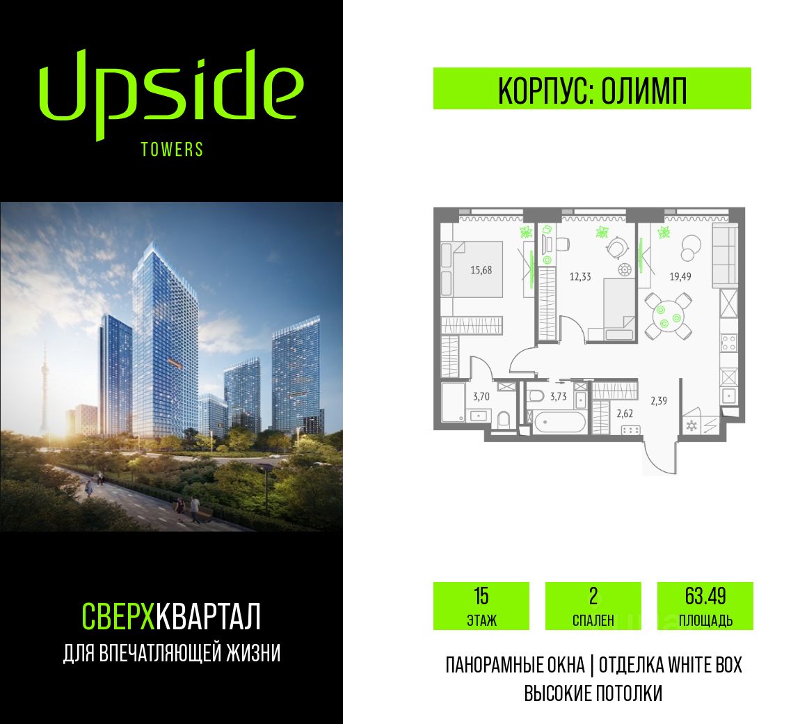 Продаётся 2-комнатная квартира площадью 63.49 кв.м на 15 этаже 19 этажного корпуса Олимп в квартале небоскребов ''Upside Towers''. В квартире отделка White-box, c видом на корпус Эльбрус, Бизнес-парк Останкино, прогулочный бульвар, детский сад, школу, Останкинскую башню. Номер квартиры В1504.