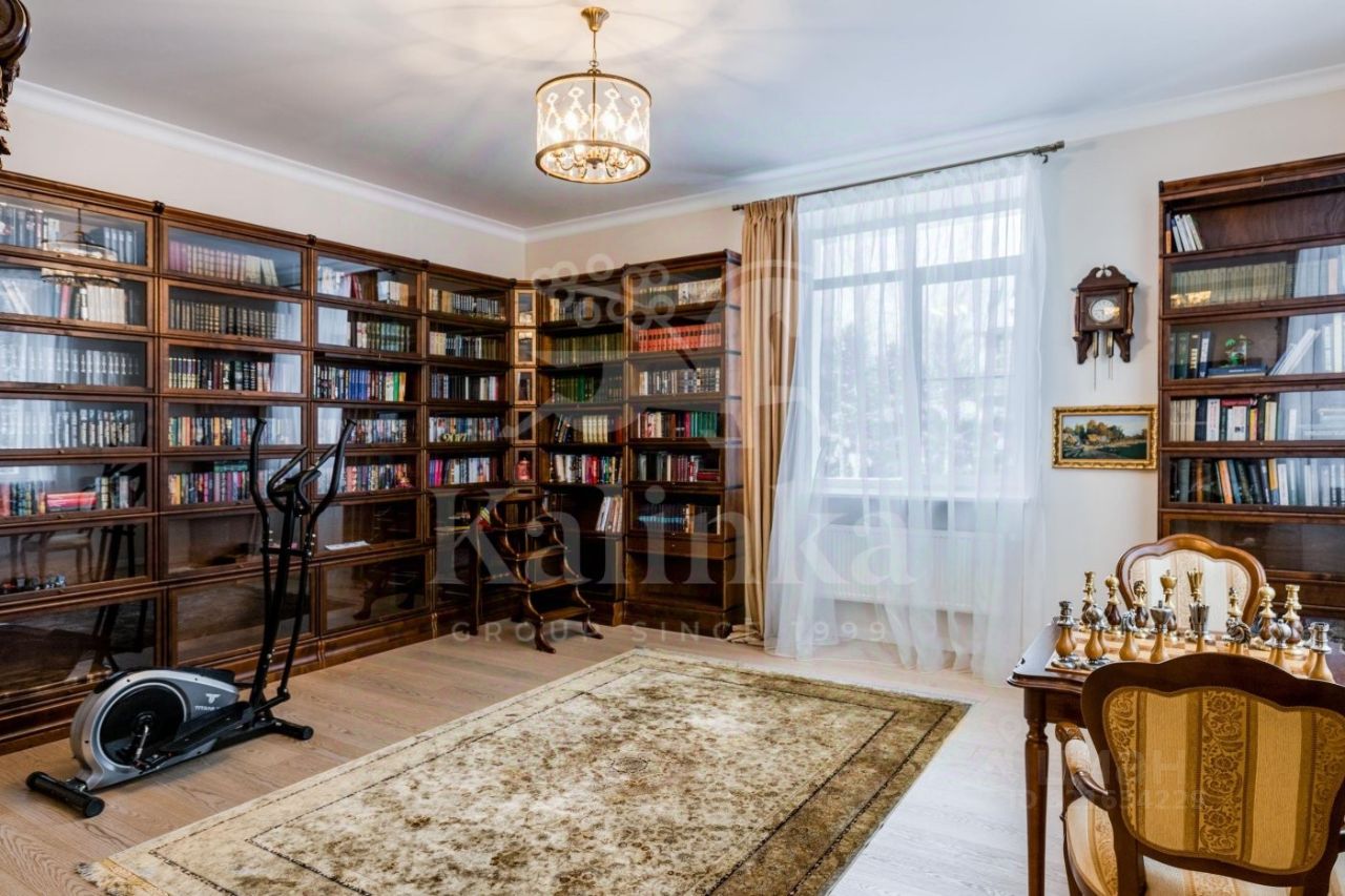 Планировка: 1 этаж: прихожая, гардеробная, санузел, холл, гостиная с камином, библиотека, столовая, кухня с выходом на террасу, постирочная, 2 этаж: холл, мастер-спальня с гардеробной и ванной комнатами, 3 спальни с санузлом, детская игровая комната, Мансарда: кабинет, спальня с гардеробной и ванной комнатами, спальня с санузлом, комната для персонала с санузлом, кладовая.