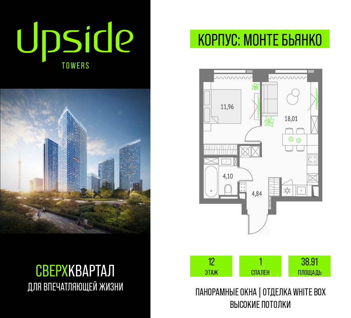 Upside Towers - технологичный квартал строится в динамично развивающемся Бутырском районе, в 3 мин. от метро, в 5 мин. от ТТК. На территории 7 га возводится 5 высотных башен от 19 до 58 этажей, названных в честь главных вершин земли. Квартиры с панорамными окнами в пол, высокими потолками и современными инженерными решениями. Благоустроенная зеленая территория включает: приватные дворы, природный комплекс, прогулочный бульвар, ландшафтный парк 2,5 га с сенсорным садом и многофункциональными игровыми и спортивными площадками.