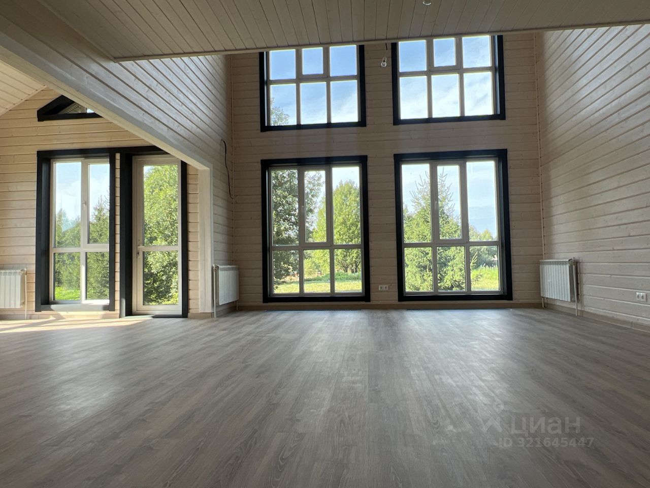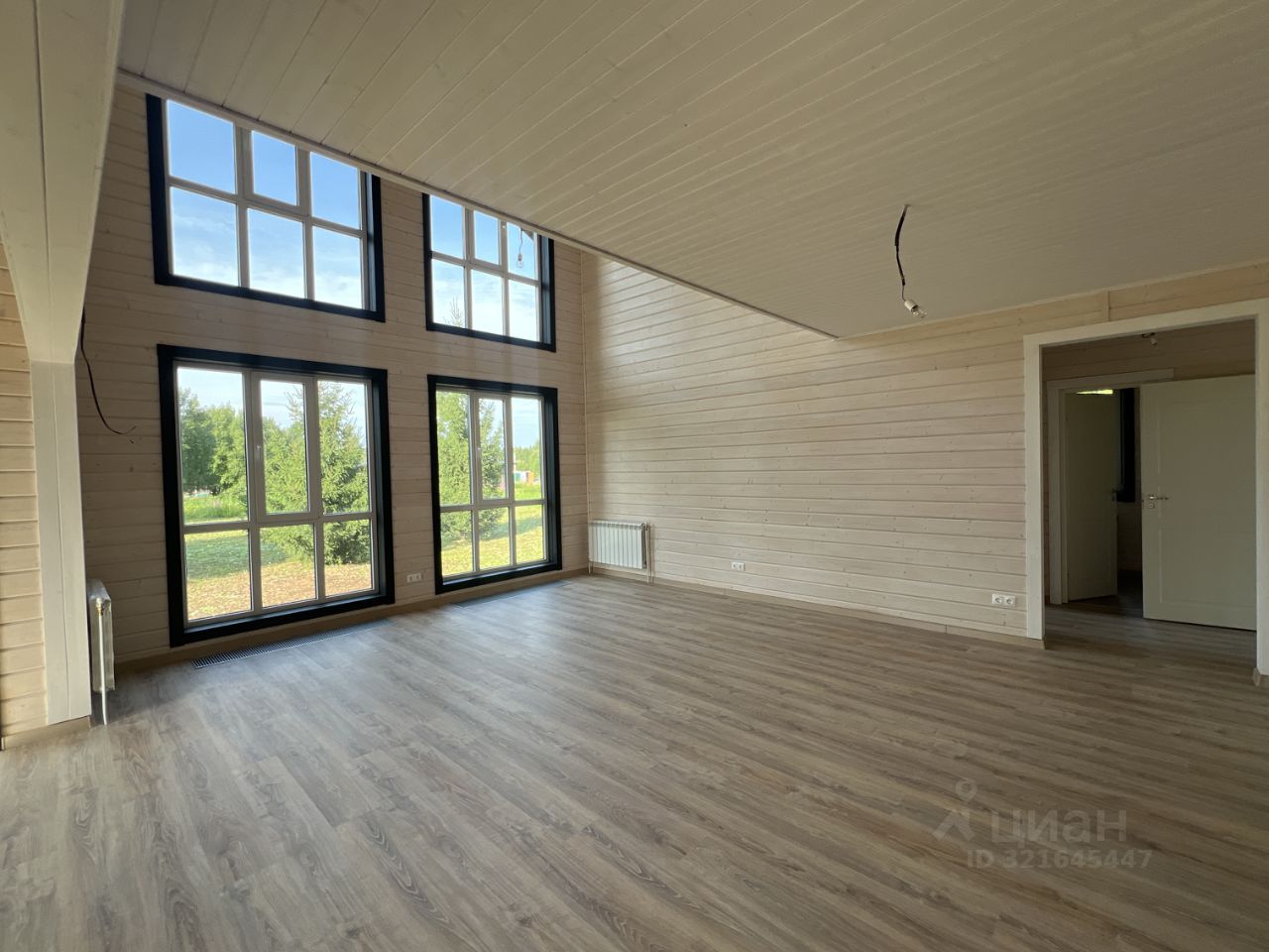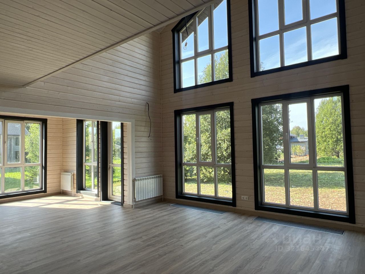 Огромные окна открывают вид на участок с елями и наполняют каждый день атмосферой уюта и гармонии с природой.