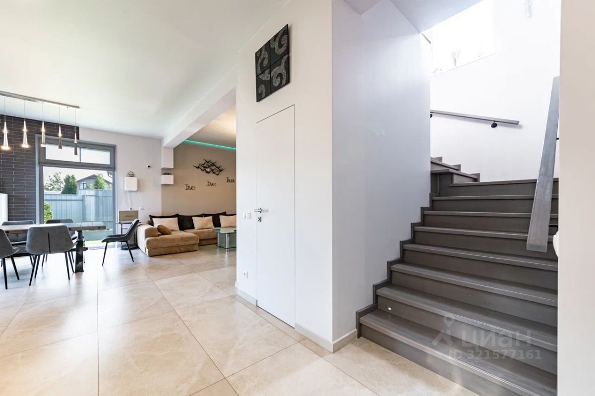 Первый этаж включает прихожую с гардеробной, котельную с газовым котлом, а также резервный электрический котел, просторный санузел оснащен финской сауной Harvia с возможностью влажного и сухого пара, большую кухню-гостиную ,лестничное пространство организовано для хранения, а большая терраса отделана натуральной лиственницей. Полноценный погреб площадью 15 кв.м. добавляет функциональности.