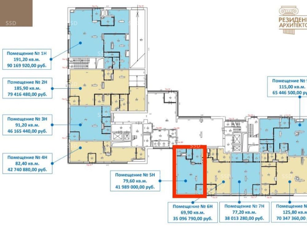Технические характеристики: Помещение 5Н общей площадью 79,6 кв. м., 1 этаж. Отдельный вход. Витринные окна. Открытая планировка. Высокие потолки. Электрическая мощность 15,9 кВт. Центральные коммуникации. Отапливаемая подземная парковка, собственный пешеходный бульвар.